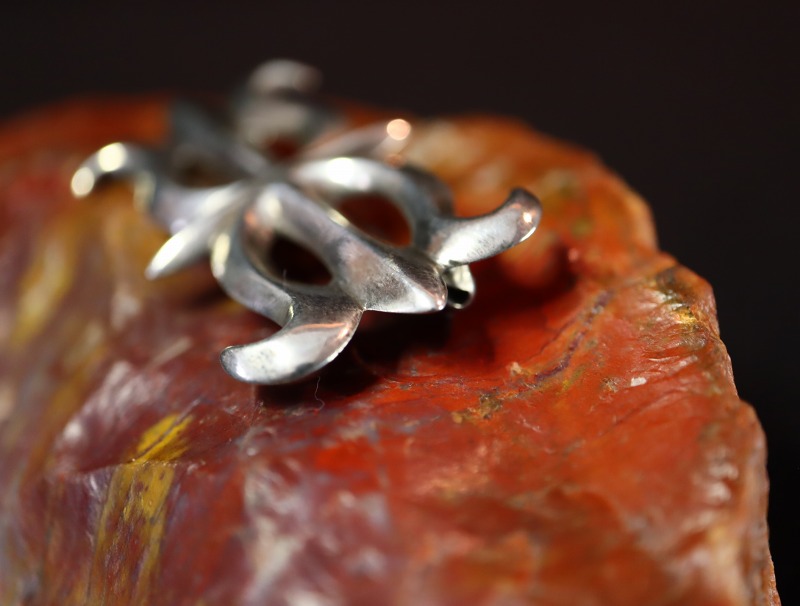 また、サンドキャストによる成形技術は、ナバホジュエリーの古典期から現在に至るまで大きく変わっておらず、その製法やデザインスタイルも長く受け継がれていますが、現在では多くが同一の『型』を使用した作品となってしまいました。本作は、量産向けにパターン化された『型』によるピースではなく、作者のオリジナリティーを感じさせ、裏面の研磨等の仕上げ工程やエッジのしっかりとした造り等、細部のディテールに1960年代以前のサンドキャスト作品に多くみられる上質感を持っています。