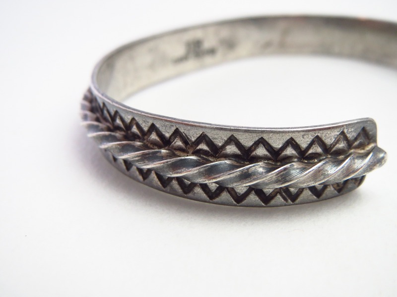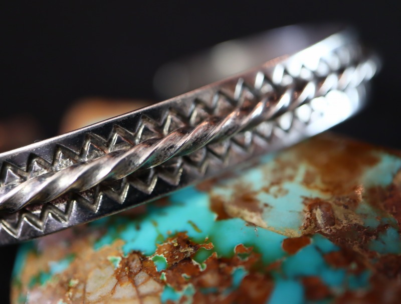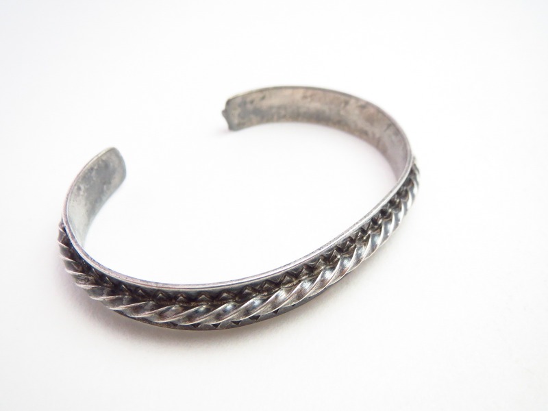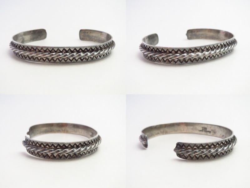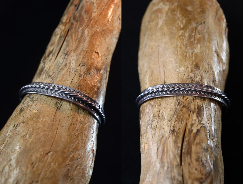 1920年代末~1930年代頃に制作された作品と思われ、日本においては『平打ち』と呼ばれるフラットなシルバープレートをベースに、中央にツイステッドワイヤーを重ねロウ付けする事でバンドが構成されています。全て伝統的な技術やディテールによって形作られたとてもシンプルな造形ですが、意外にもビンテージ作品では珍しいデザインとなっています。さらに、ツイステッドワイヤーの上下には、規則正しく力強いスタンプワークが施され、シェブロン模様/ジグザグが刻まれており、非常に古い作品でありながらシックでエッジ―な、どこか現代的な表情に仕上げられています。