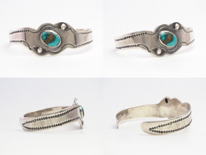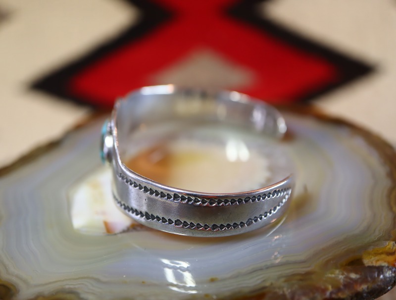 インゴットシルバー(銀塊)から成形されたシルバーはそれほど分厚くはありませんが独特の重量感があり、スネーク独特の曲線で構成されたバンドがベースとなっています。中央にはオーバルカットの味わい深いターコイズが斜めにマウントされており、その左右から蛇が石を咥えたようなデザインとなっています。ターコイズの上下にはシェルコンチョのリポウズ/バンプアウトが施され、それらの左右に力強いスタンプが刻まれることで、蛇の目が立体的に怪しく描き出されています。さらに、円弧を描くスタンプや小さな三角形の文様を刻むスタンプワークが施されていますが、それらは、バンドをフレーミングするのみで複雑な表情を生み出さず、シルバーのクリーンな質感を生かしたシルバーワークとなっています。