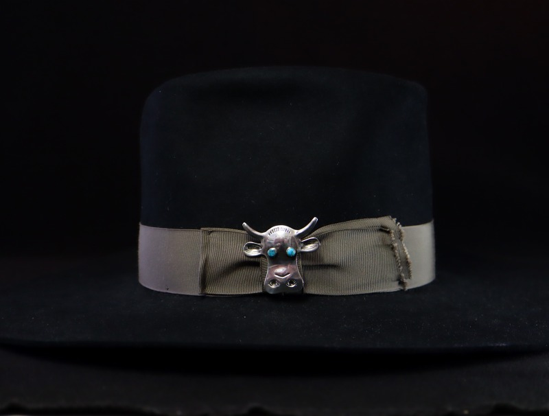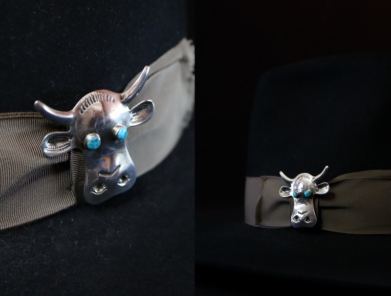 1930年代~1940年代頃に作られたと思われ、カウヘッドのモチーフやどこか可愛いデザインは、キャッチーな印象となっていますが、全てのシルバーワークは丁寧な手作業による伝統的な技術とディテールで構成されています。巧みなカッティングにより、カウヘッドのシェイプが切り出され、部分的なリポウズ/バンプアウトによって全体にも細部にも立体的なボリューム感が与えられており、角や耳等、柔らかな曲面によって柔らかな印象と上質感が生み出されています。このようなリポウズやバンプアウトと呼ばれる技術は、木(丸太)やレッド(鉛の塊)に施された凹みに、地金となるシルバーをハンマーで叩き沿わせることによってドーム状の膨らみを作り上げており、非常に細かく何度もタガネで叩き沿わせる高度なハンマーワークで成形されています。