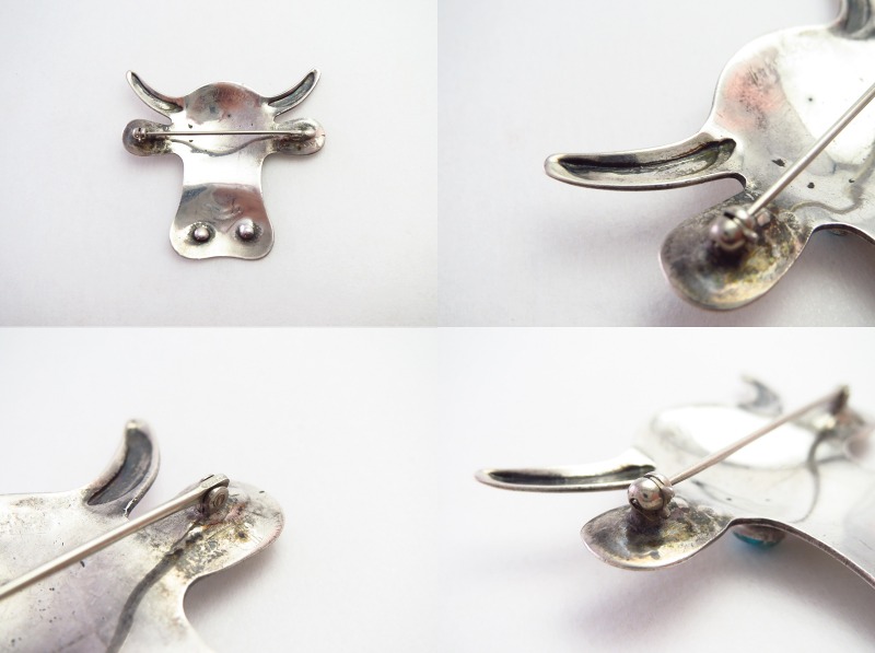 また、こちらの作品を制作したシルバースミス個人を特定することはできませんが、上記のような突出した技術や独自性を持った作者を想起させる完成度を持っています。ポップな印象のカウ/牛モチーフはキャッチーなデザインながら、洗練されたシルバーワークと造形センスによってハイジュエリーのような表情と上質感を感じさせるピンブローチです。