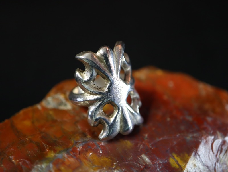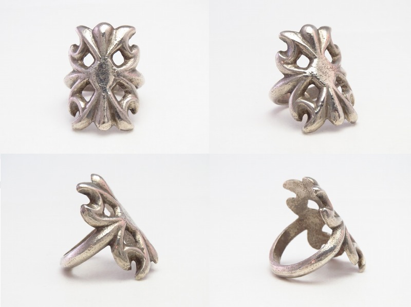 また、とてもワイドなボリューム感とワイルドな印象は大きな存在感を持っていますが、石のセットされないシルバーのみによる構成は仰々しい印象が無く、サンドキャスト/トゥーファキャスト独特のざらついたシルバーの質感とフェイスの柔らかな曲面/アールによって、ナチュラルな表情となっています。サイズは小さいですが、性別やスタイルを問わず多くのシーンにおいて自然に溶け込み、意外に取り入れて頂きやすいリングだと思われます。