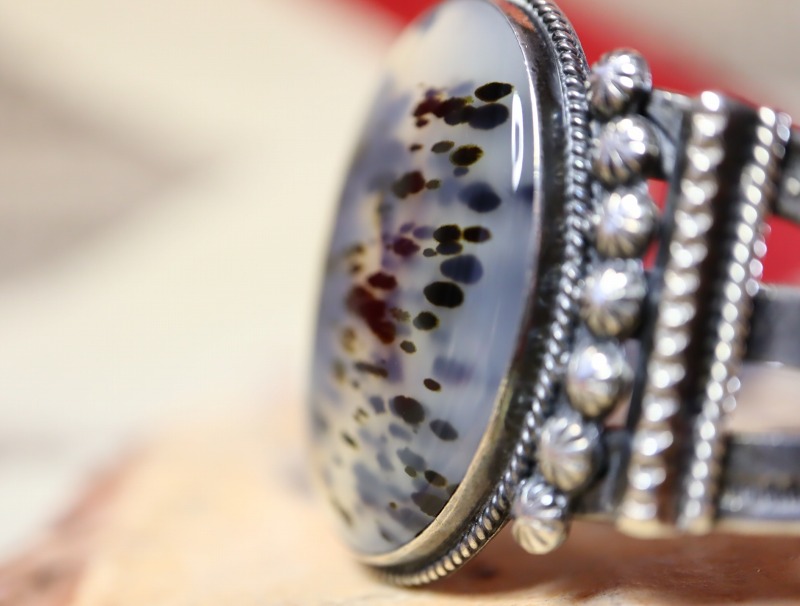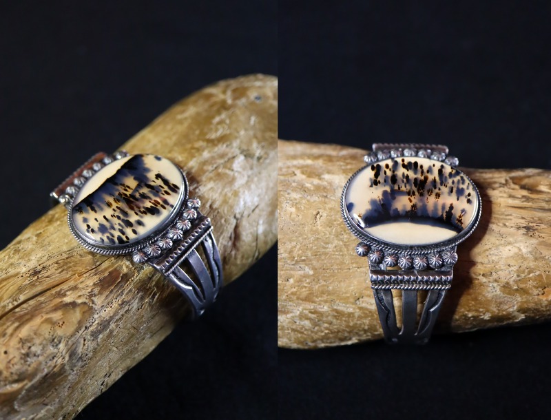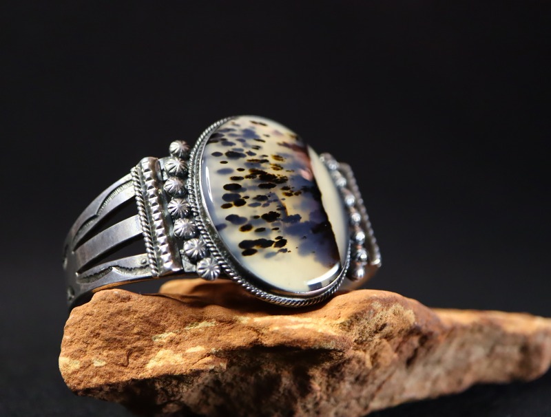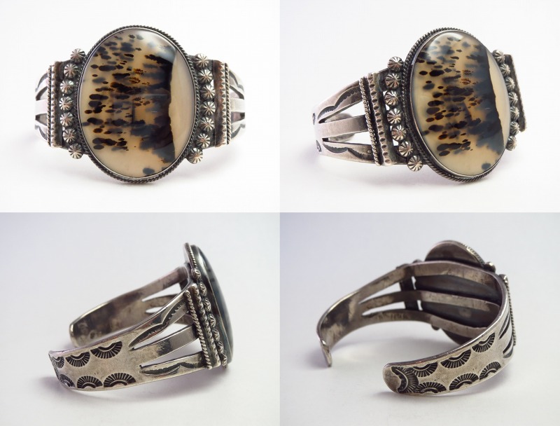 【NAVAJO】ナバホのビンテージジュエリー、「ミルククラウン」に代表される瞬間写真の様な大変独特でスペシャリティのある文様を形成している天然石【Dendritic Agate】デンドリティックアゲート/デンドライト(瑪瑙)がメインに構成されたワイドウィズなアンティーク/ビンテージバングルです。