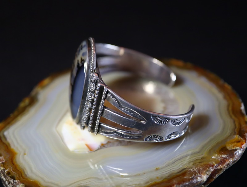 インゴットシルバー(銀塊)から成形された重厚なバンド/地金は『スプリットバンド』と呼ばれる伝統的な造形で4本に割り開かれており、フロントが広くターミナル(両端)が細くなる造形となっています。その中央に大きくオーバルカットされたデンドリティックアゲート/デンドライトがマウントされており、ベゼル(覆輪)には細いツイステッドワイヤーが施されています。さらに、その左右には小さなシェルコンチョが7つずつ配されています。さらに、それらの外側には細かなスタンプワークの刻まれたトライアングルワイヤーとツイステッドワイヤーがそれぞれ施されており、それらの立体的なシルバーワークにより、中央に鎮座する特別な石の存在感を巧みにシルバーバングルに馴染ませているようです。さらに、サイド~ターミナルにはナバホらしい力強いスタンプワークが施されており、全てナバホジュエリーのオーセンティックな造形スタイルで構成された作品ですが、やはり石の生み出す表情と個性により、どこかクリーンで落ち着いた雰囲気と共に作者の個性や拘りやオリジナリティを感じる作品となっています。