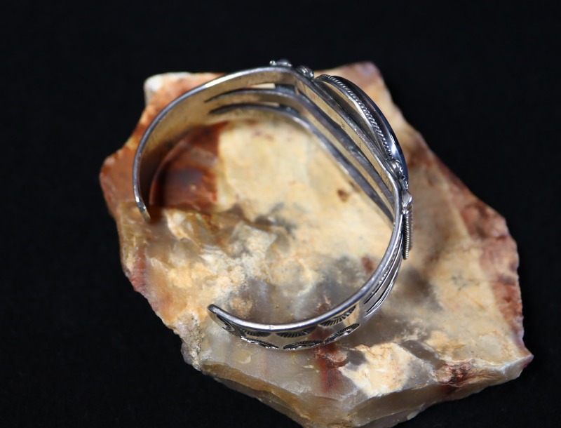 1950年代後半~1960年代前後に作られた作品と思われ、ナバホの伝統的な技術やディテールによって作り上げられた作品ながら、非常に特徴的で他に類を見ない石がマウントされることで、唯一無二のオリジナリティを持ったブレスレットとなっています。