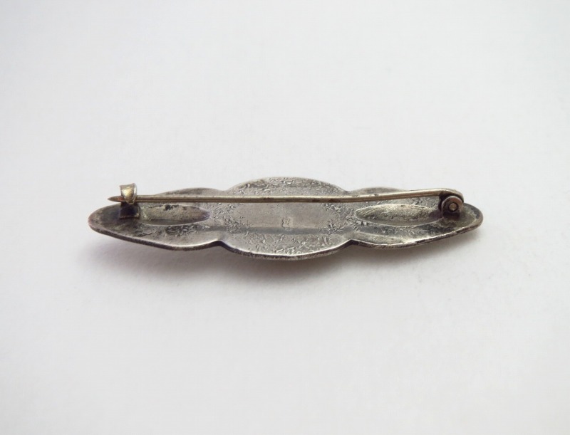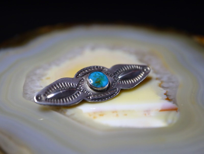 1940年代~1950年代頃のピースと思われ、おそらくインゴットシルバー(銀塊)から成形された地金をベースに、丁寧なカッティングワークによってバー形状をベースとした独特のシェイプが切り出されています。その中央にラウンドカットされた美しいブルージェムターコイズがマウントされており、両サイドには鏨(鉄製の金型ツール)を用いてシルバーを叩き出すことで作るリポウズ/バンプアウトが施されています。硬いシルバーに立体的な叩き出しが作られることで、小さなピンブローチに立体感と上質感が与えられているようです。さらに、全体に細かな文様を刻むスタンプワークが施されることで奥行きを持った作品に仕上げられています。また、それらのスタンプ(鏨)ツールも現代の作品では殆ど見られない非常に細かな文様を内包しており、アンティーク作品特有の高いクオリティを誇るスタンプが使用されています。