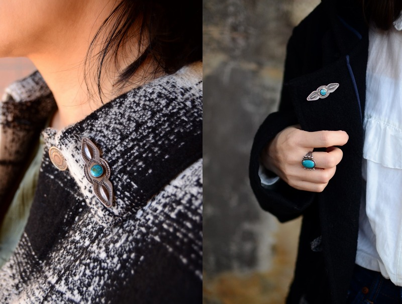 また、控えめなボリューム感は多くのスタイルに良く馴染み、インディアンジュエリー独特のナチュラルでエスニシティーなアクセントとして使いやすいピース。ハット等のワンポイントやラペル、バッグ等にもフィットしますし、日常的なスタイルにおいて、さり気なくも効果的なアクセントとなり得るピンブローチです。
