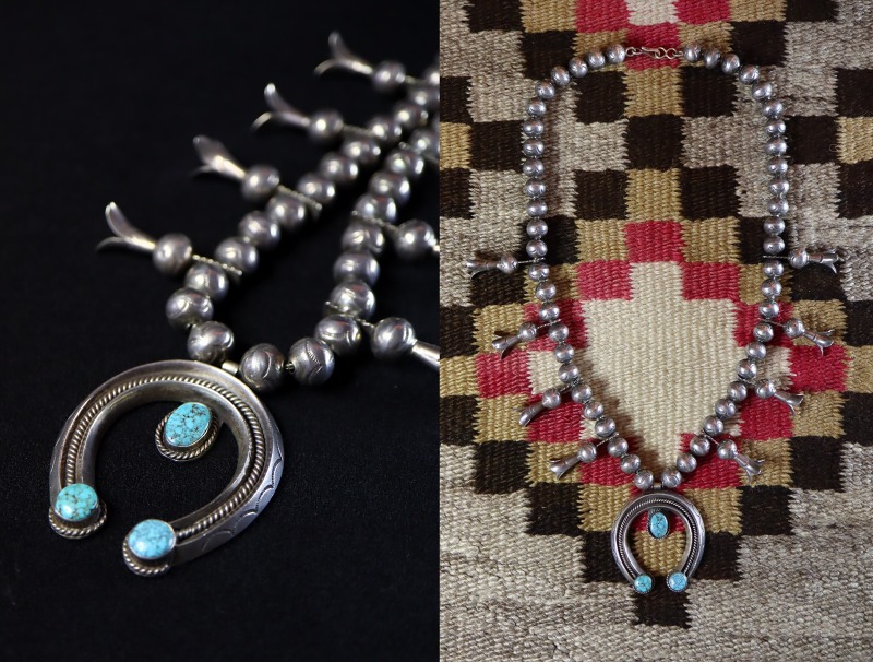 1940年代末~1950年代頃に作られたものと思われ、本作はスカッシュブロッサムナジャネックレスの中でも珍しい比較的小さいサイズの作品となっています。トップのナジャは、サンドキャスト(砂型鋳物)から成形された重厚な2本のトラインアグルワイヤーとそれらの中央に配されている1本のツイステッドワイヤーで構成されており、左右の両端とセンターにはカボションカットされた美しいターコイズがマウントされています。そのベゼル(覆輪)にもツイステッドワイヤーが施されており細部まで手の込んだ細工があしらわれています。