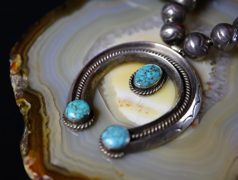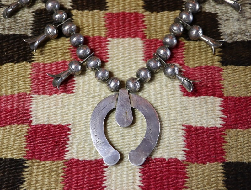 また、そのスカッシュブロッサムパーツにも本作の特筆すべき特徴が見られます。それは、ビーズネックレスと接続している部分の厚みにバイアス方向のとても独特なファイルワーク(鑢で削る技術)による刻みが施されているディテールです。このようなディテールは、1910年代以前のスカッシュブロッサムナジャネックレスにおいてみられるディテールであり、使用されるシルバーが薄くなった1930年代以降にはほとんど見られないディテールとなっています。本作の場合には、ビーズのフォルムやナジャのシェイプ等を含め、1910年代以前に作られた古典期の作品を想起させる造形となっており、アーリーナバホジュエリーを意識した作者の感性・美意識を推し量ることが出来ます。