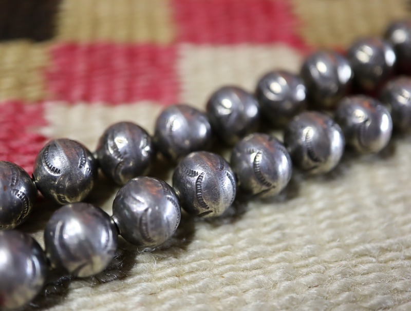 シルバービーズとスカッシュブロッサムパーツも大変質の高いシルバーワークで形作られており『ナバホパール』や『デザートパール』とも呼ばれるハンドメイドシルバービーズをベースとしながら、それら全てにさり気なくも力強いスタンプワークが刻まれています。このようなベンチメイドシルバービーズ等もすべて古い製法で作られており、確かな技術と高いセンスを感じることのできる作品です。現在では限られた作家しか作らないベンチメイド(ハンドメイド)のビーズは、材料の加工からの全ての工程を手作業により作り上げられており、コンチョを作るような手法で半球体を制作し、それら二つをロウ付けすることでビーズに成形しています。さらに本作では、球体としての成形前にスタンプを深く刻み込んでおり、奥行きと複雑な表情が与えられています。また、それらのスタンプ(鏨)は、成形上で少し違ったシェイプとなっていますが、おそらくナジャトップに刻まれているスタンプ(鏨)と同じスタンプが使用されており、作品としての纏まりを生み出しているようです。そして、同じビーズを使用したスカッシュブロッサムパーツが左右に4個づつ配されており、控えめながら広がりのある造形に仕上がっています。