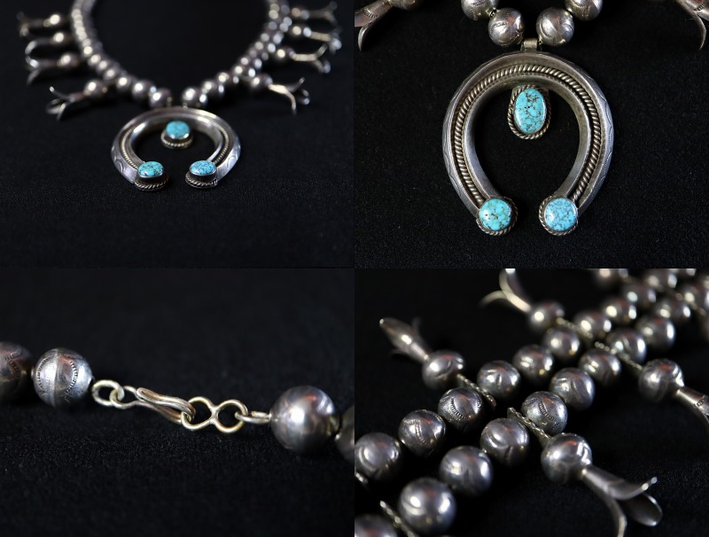 【NAVAJO】ナバホのビンテージジュエリー、伝統的なディテールによって構成され、控えめなボリューム感ながらとても重厚でオーセンティックな作品。丁寧で秀逸なシルバーワークをベースに、ネバダブルーターコイズと思われる大変美しい石がマウントされたハイエンドなアンティーク/ビンテージスカッシュブロッサムナジャネックレスです。