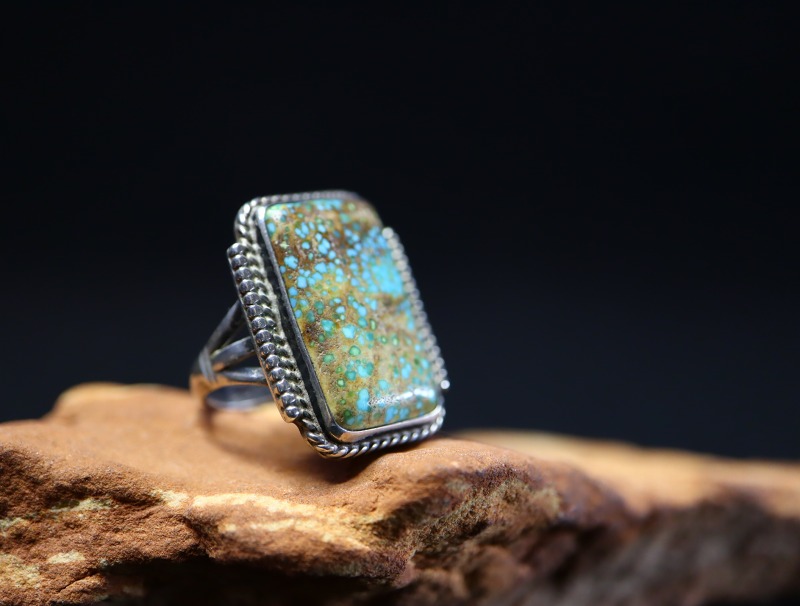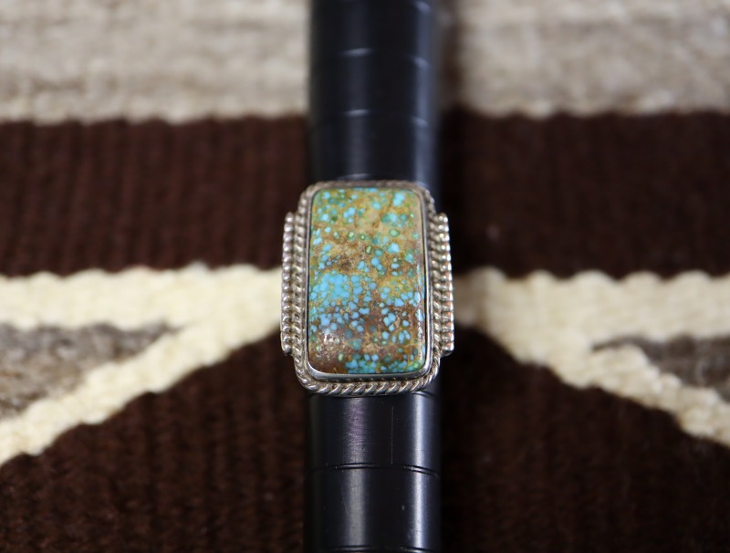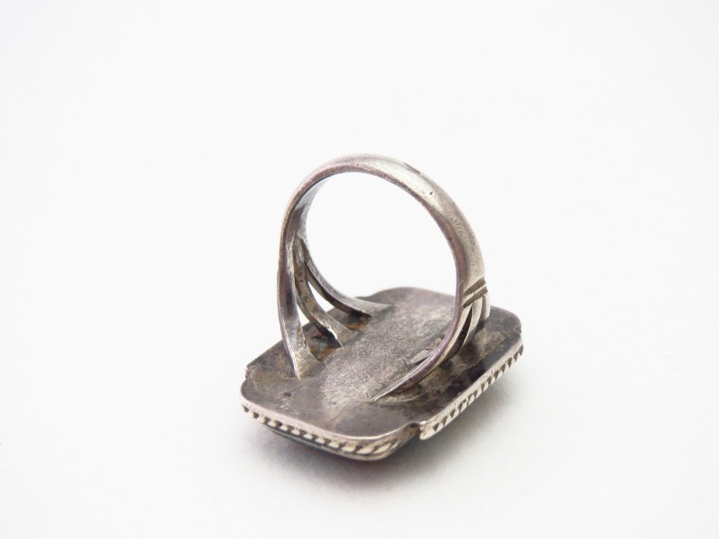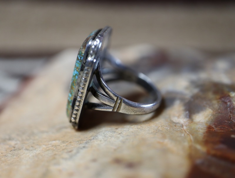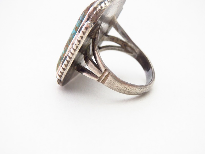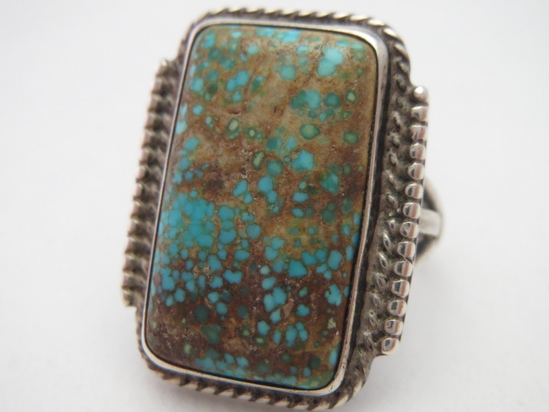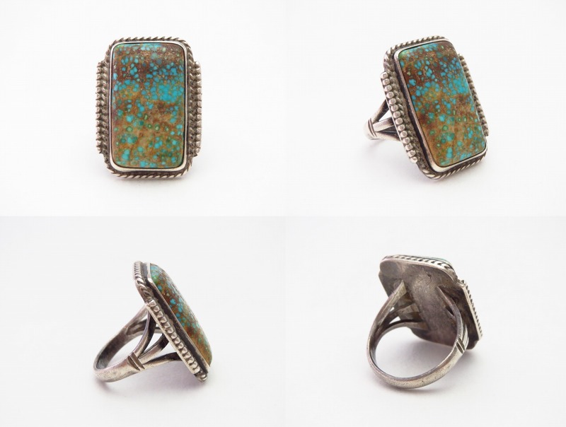 【NAVAJO】ナバホのアンティークジュエリー、伝統的で秀逸なシルバーワークをベースに、レクタングラー/長方形シェイプにカットされたワイドウェブナンバーエイトターコイズがセットされた作品。オーセンティックでシンプルな造形により、クラシックな雰囲気に仕上げられたビンテージ/アンティークリングです。