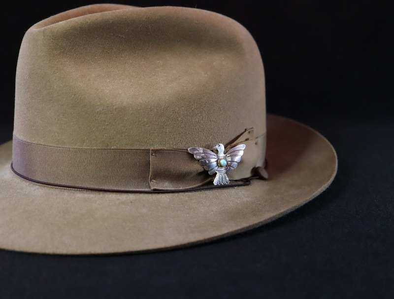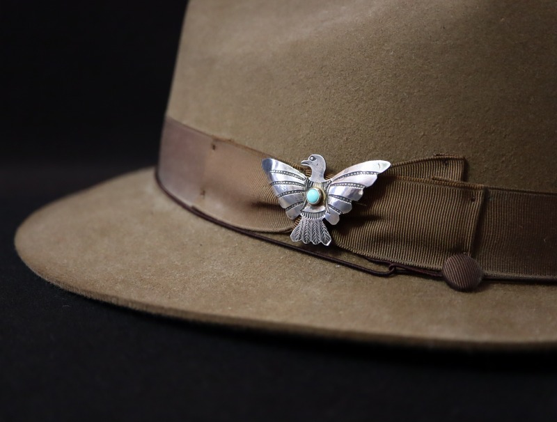 本作のサンダーバードは、翼を広げたイーグルに近いデザインにより雄々しい印象を持ち、ツーリストアイテム特有のチープな印象を作らない丁寧なシルバーワークも魅力的な作品。また、使いやすい控えめなボリューム感と素朴な質感を持ち、こちらのようなピンはアウターのアクセントととして、ラペルや襟等にもフィットしますし、ハット等のワンポイントにも使い勝手の良いピースです。
