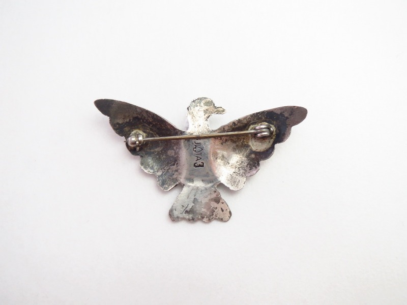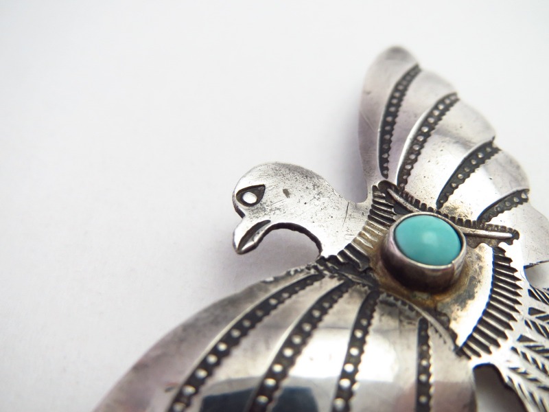 【NAVAJO】ナバホのアンティークジュエリー、内側のホールマークから【United Indian Trader's Association】(UITA)に参加していたトレーダー(トレーディングポスト)の販売したピースであり、末尾のナンバー『3』は詳細の不明なナンバーとなっていますが、 現在のところ【Toadlena Trading Post】トードリーナトレーディングポスト/【Two Grey Hills Trading Post】トゥーグレイヒルズトレーディングポストで作られたと紹介される事の多いナンバーです。ハンドメイドのシルバーワークが味わい深いサンダーバードモチーフのアンティーク/ビンテージピンブローチです。