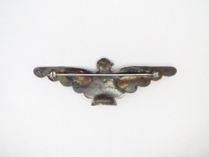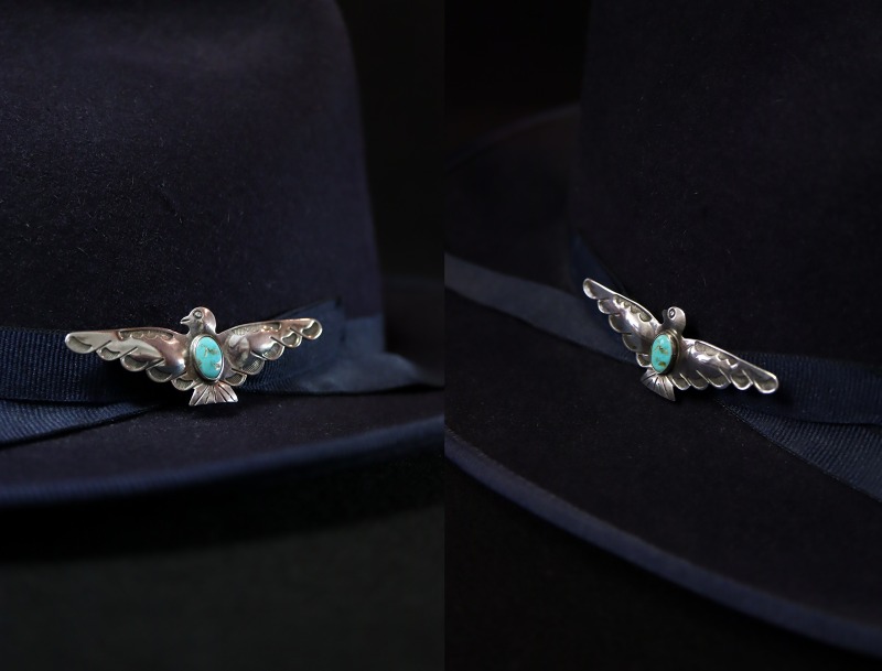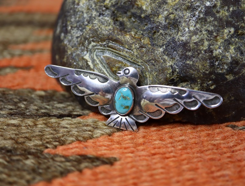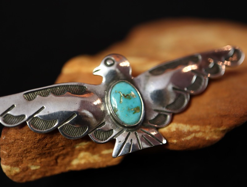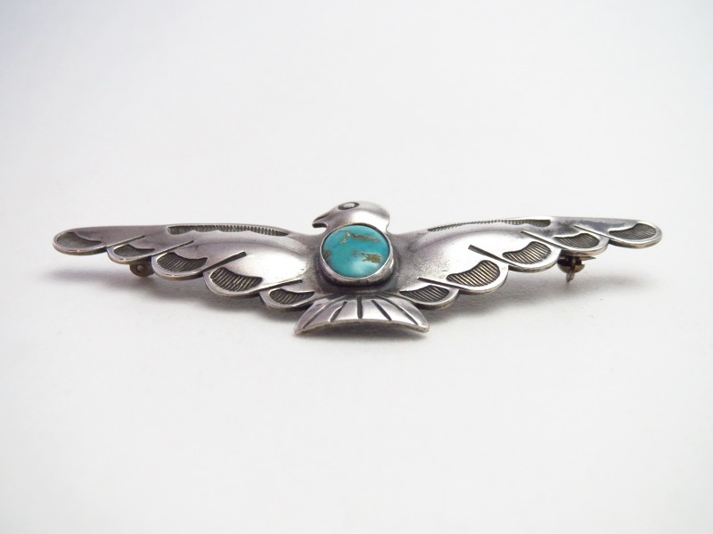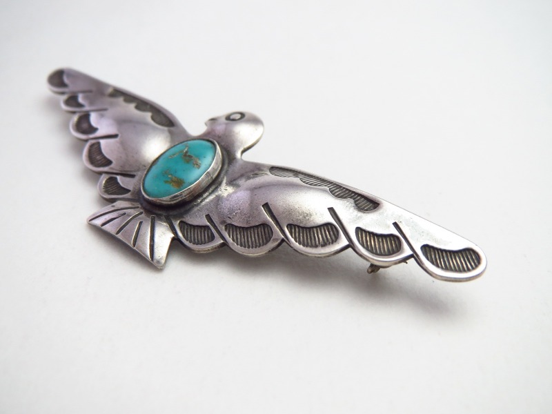 【Tourist Jewelry】ツーリストジュエリーや【Fred Harvey Style】フレッド・ハービースタイルと呼ばれる、20世紀前半頃にアメリカ中西部の観光客向けに制作されたスーベニアアイテム(土産物)の一つ。可愛い表情のサンダーバードシェイプに綺麗なターコイズがマウントされたアンティーク/ビンテージピンブローチです。