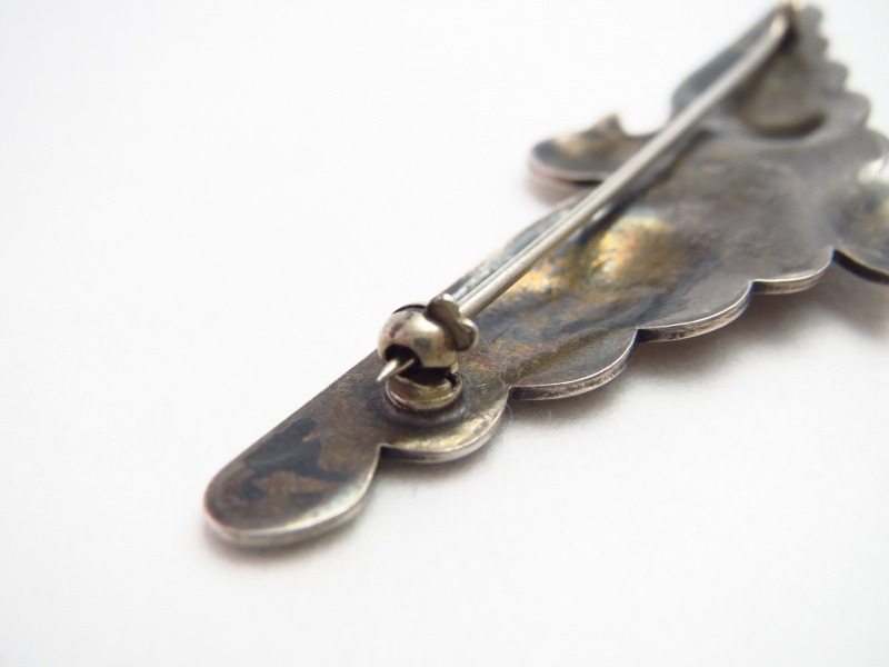 1930年代後半頃~1950年代製と思われ、ツーリストジュエリー/フレッド・ハービースタイルを代表するようなサンダーバードモチーフのピース。可愛い表情が特徴的で細かな動きのあるサンダーバードシェイプが構成されています。顔や翼等の細部はスタンプによって描き出されており、翼のエッジは『スキャロップドエッジ』(ホタテ貝)とも呼ばれる細かな動きのあるシェイプに造形されています。さらに、翼や顔、尾の部分に、それぞれ独立してアール/曲面が施されており、立体的で有機的な表情を持った造形となっています。