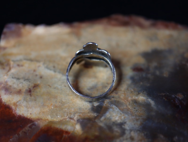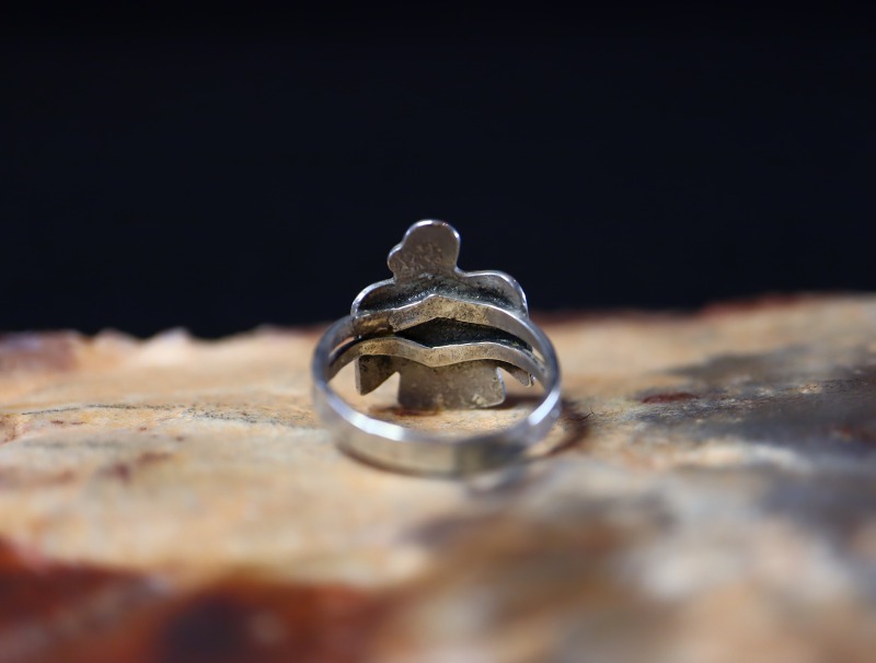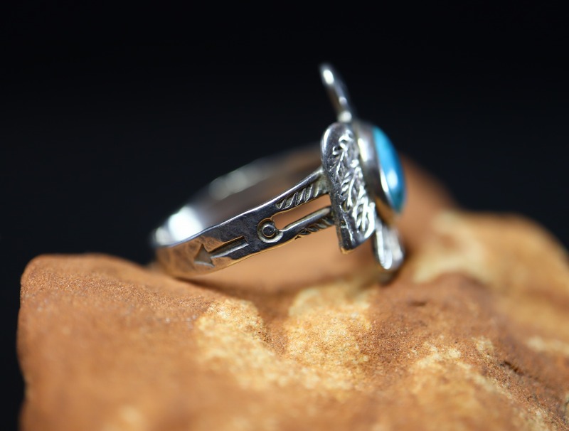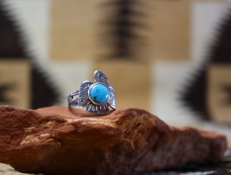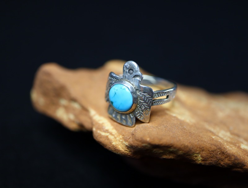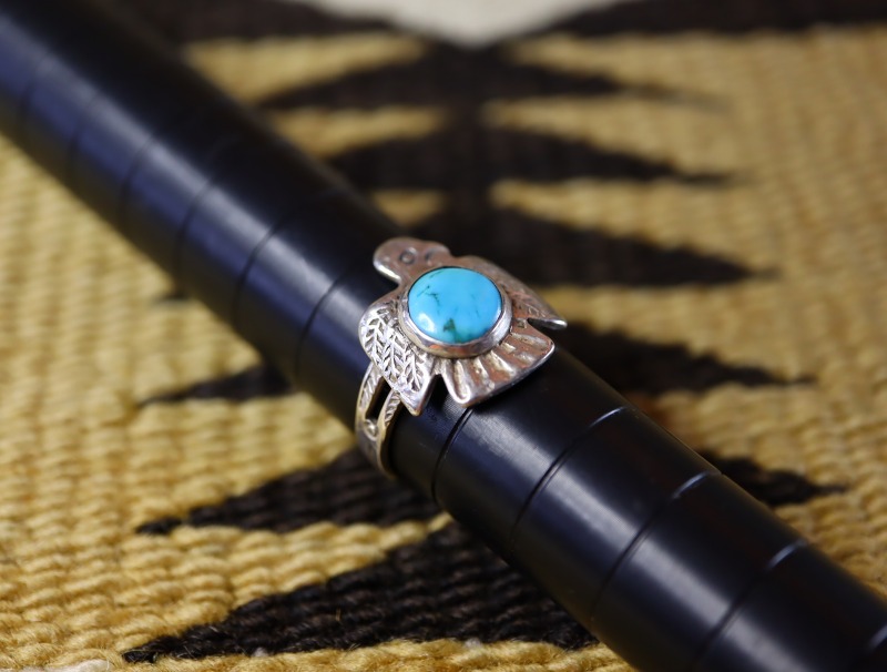 こちらの作品も、フェイスのサンダーバードがキャッチーでアイコニックな造形ながら、ビンテージインディアンジュエリーらしいエスニシティな魅力により、大人向けのアイテムに昇華されていると思います。また、ターコイズがマウントされることによって存在感のあるリングとなっており、日常のコーディネイトに良いアクセントとなってくれるリングです。