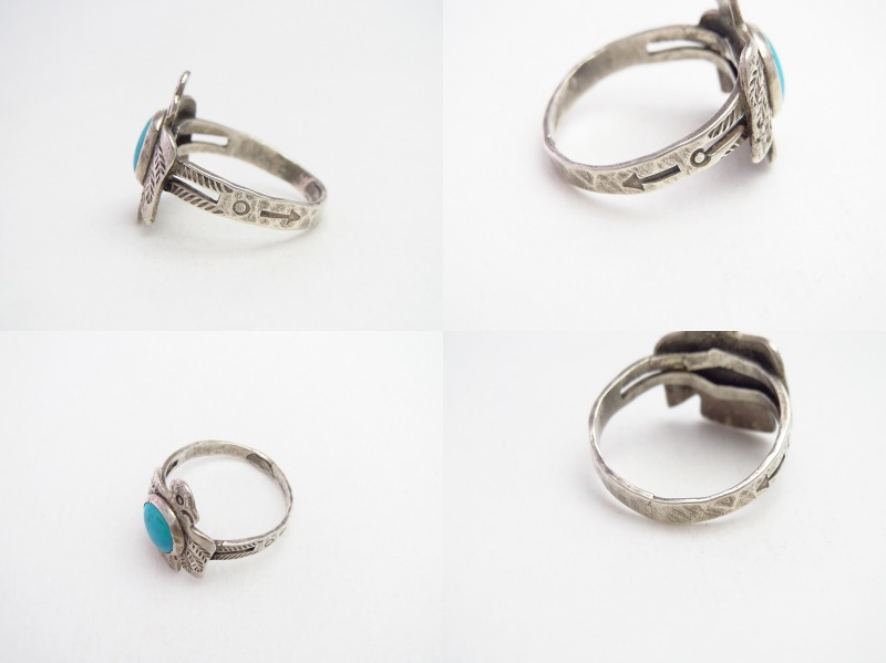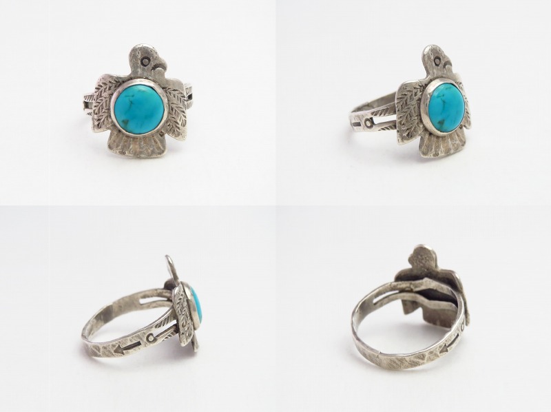 1930年代~1950年代製と思われ、シャンクは『スプリットシャンク』と呼ばれる伝統的な造形で2本に割り開かれており、サンダーバードのアップリケ/パッチワークでフェイスが構成されています。また、そのサンダーバードの顔や翼等、細部はスタンプワークが刻まれる事によってを描き出されており、そのセンターにはラウンドカットされたターコイズがマウントされています。さらに、シャンクにもアローヘッド等のスタンプワークが施されており、ビンテージインディアンジュエリーらしい表情豊かなリングに仕上がっています。シルバーワークには粗暴な部分も見られますが、それらもアンティークらしい味わいとなっており、可愛いモチーフでありながらチープな印象を持たないリングとなっています。