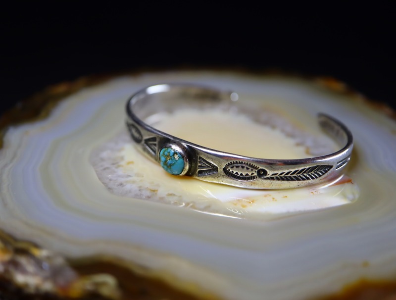 また、ツーリストジュエリーと同じように手軽で少しキャッチーな印象も感じさせますが、伝統的な製法により造形された、プリミティブで素朴な表情を持った味わい深い作品。ナバホジュエリーのオーセンティックなデザインと、ターコイズのワイルドでアーシーな質感は、ナチュラルにコーディネートに馴染みやすく、長年にわたってご愛用いただけると思われます。単独でもしっかりとした存在感を放ちますが、他のブレスレットとの重ね付けにも向いており汎用性の高い作品です。