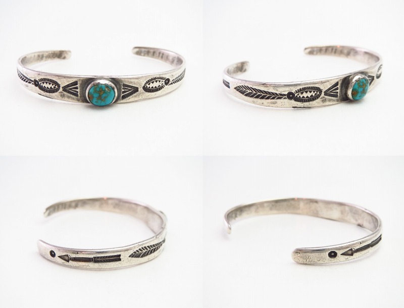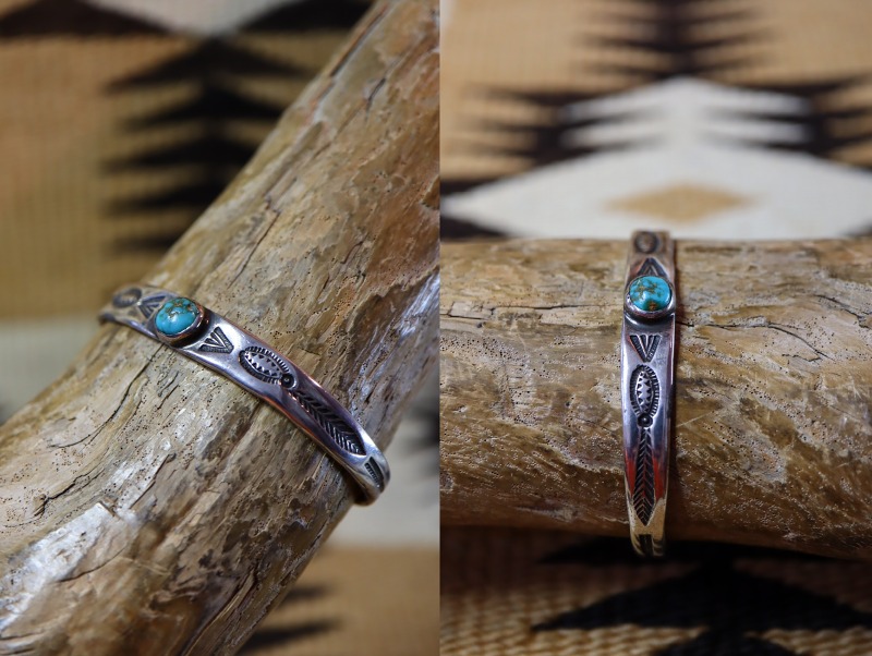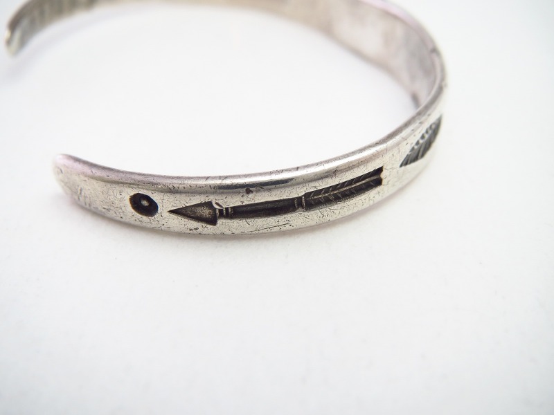 【NAVAJO】ナバホか【PUEBLO】プエブロのアンティークジュエリー、インゴットシルバー(銀塊)から成形されたバンド/地金をベースに、フェザーやアローモチーフ等のトラディショナルながらセンスを感じさせるスタンプワークが施された作品。比較的珍しい女性に向いたサイズのアンティーク/ビンテージバングルです。