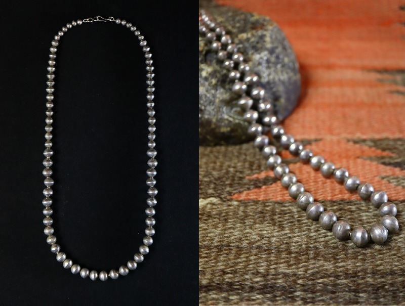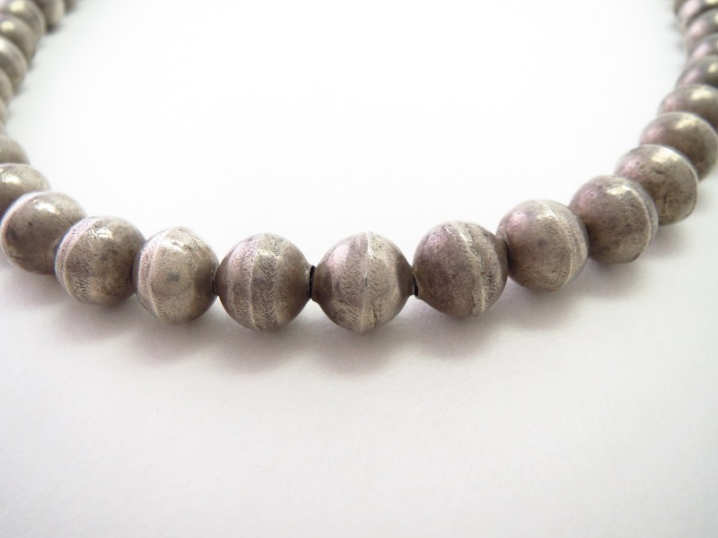 【NAVAJO】ナバホか【PUEBLO】プエブロのビンテージジュエリー、『ナバホパール』とも呼ばれる74個ものベンチメイド(ハンドメイド)シルバービーズで構成された作品。シンプルながら伝統的な製法による味わい深い表情等、ナバホジュエリー独特な魅力を宿すアンティーク/ビンテージネックレスです。