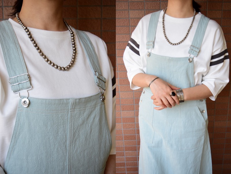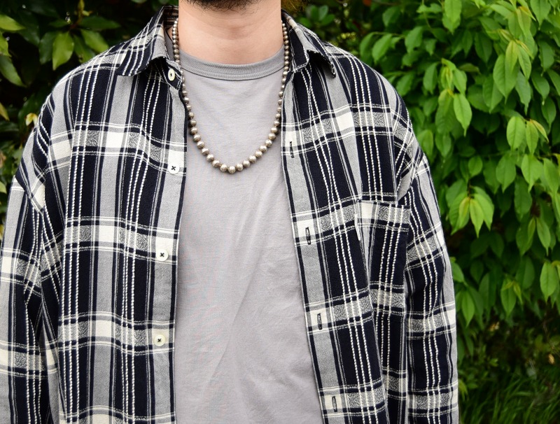 派手さのないシンプルなネックレスですが、渋いシルバーの表情により、武骨でビンテージインディアンジュエリーらしい雰囲気を醸し出しています。またその印象は、性別や季節を問わず多くのスタイルにフィットし、日常の良いアクセントになるアイテム。女性にはエレガントにフィットしますが、男性にもさりげなくお使いいただける非常に汎用性の高いネックレスです。