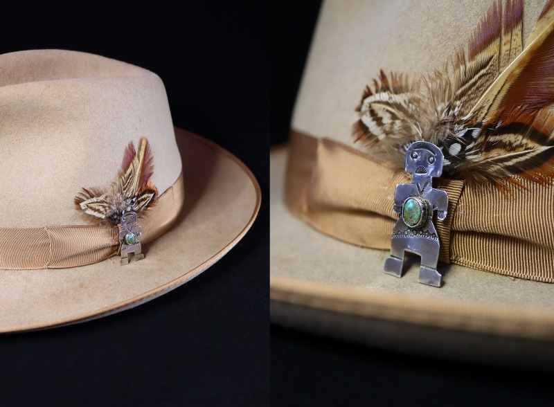 独特のシェイプにカットされ、その素朴な造形/デザインから、おそらくヒューマンのモチーフと思われますが、精霊イェイをモチーフにしている可能性も考えられます。おそらくインゴットシルバー(銀塊)から成形された地金は、比較的薄く仕上げられていますが、手作業のカッティングワークによって切り出されたシェイプは、スクエアな顔を含め全身が直線的に表現されています。それはレゴブロックの人形のような可愛さと不思議な魅力を持っています。また、顔などの細かな部分はスタンプワークによって描き出されており、胸の部分には美しいターコイズがマウントされています。また、その石を留めるベゼル(覆輪)もベゼルカップと呼ばれる量産品ではなく、ハンマーメイド(ハンドメイド)によるシルバーワークで成形されています。