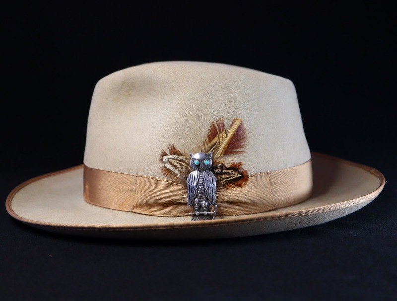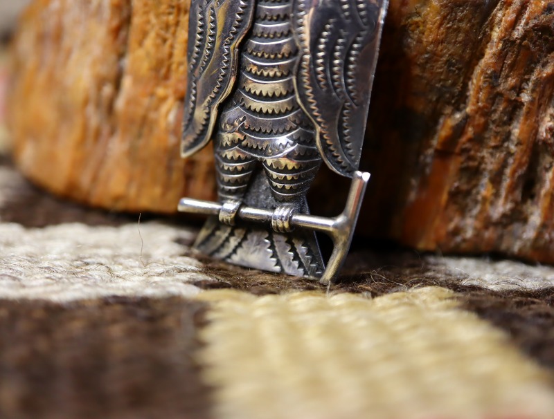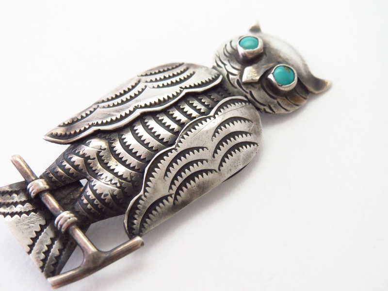 また、本作にとてもよく似たデザインに構成されたフクロウモチーフのピンブローチは、ビンテージナバホジュエリーのオーセンティックな作品として散見されます。しかしながら、本作のようにインゴットシルバー(銀塊)から成形されたと思われる地金やを緻密に立体造形し、リアリティや上質感を感じさせるピースは他に類を見ないクオリティであり、同スタイルの作品の中で突出した完成度を誇るフクロウモチーフのピンブローチとなっています。