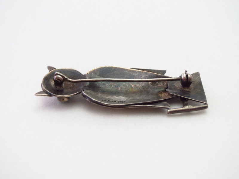 1940年代末頃~1950年代に作られた作品と思われ、おそらくインゴットシルバー(銀塊)から成形された地金をベースに、とても細かく丁寧な手作業によって立体的なフクロウが作り上げられています。愛らしい印象に図案化されたフクロウですが、脚等の有機的な膨らみや、爪までしっかりと造形された細部への拘りにより、写実的でリアルな存在感も与えられています。