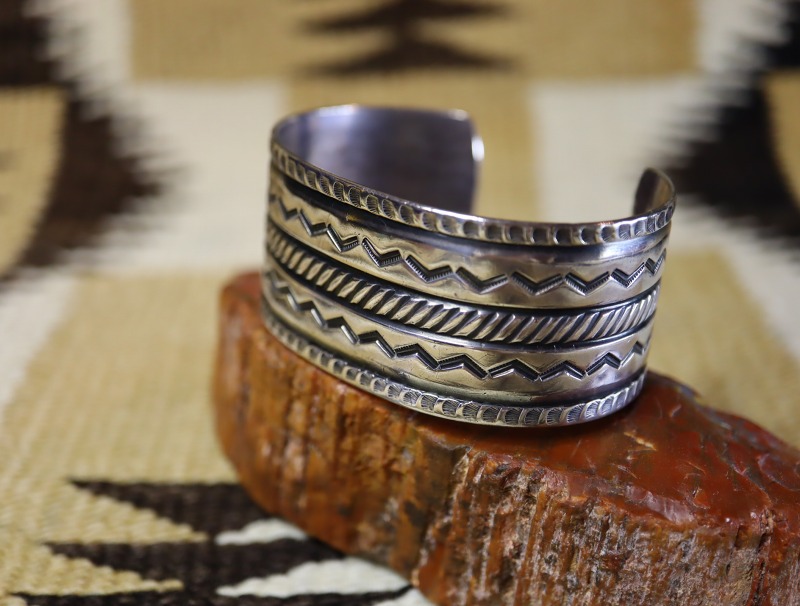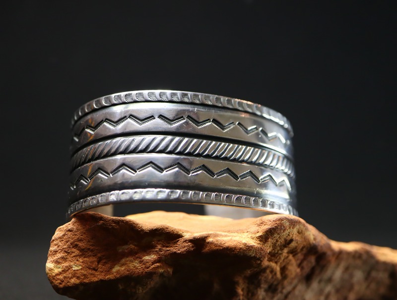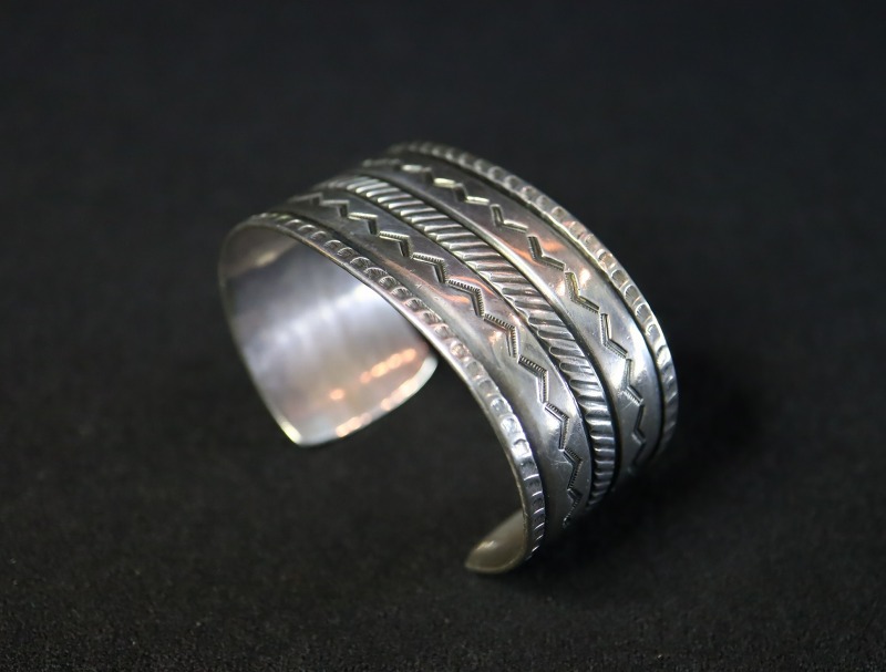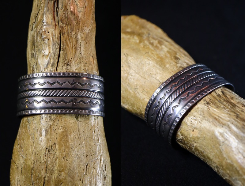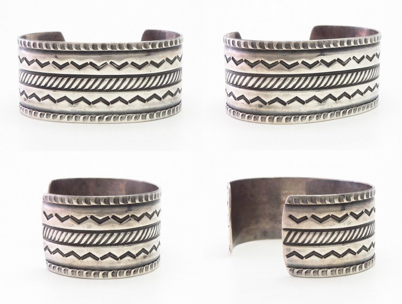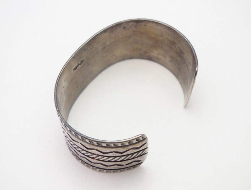 1940年代末頃~1950年代に作られた作品と思われ、ナバホの伝統的な技術や造形スタイルを踏襲しながらも少しクリーンで無駄のないデザインに仕上げられた作品。インゴットシルバー(銀塊)から成形されたバンド/地金は、とても硬くなめらかな肌に仕上げられています。そこに『ファイルワーク』という鑢で削り出す原始的な技術/技法と、『チェイシング/Chasing』と呼ばれる鏨を使いシルバーに立体的な角度を付ける(彫刻の様なイメージ)技術を駆使し、凹凸のボーダーラインが形成されています。さらに、そのライン上にも力強く連続したスタンプワーク/チゼルワークが刻まれる事で、強い陰影と奥行きを持った印象が与えられています。また、山型(くの字)のスタンプを羅列して刻むことで動きのあるシェブロン/ジグザグ模様が形成されており、プリミティブながらセンスの良いデザインに仕上げられています。