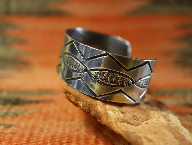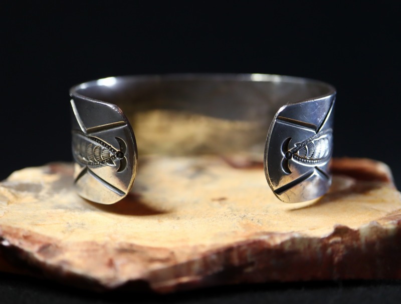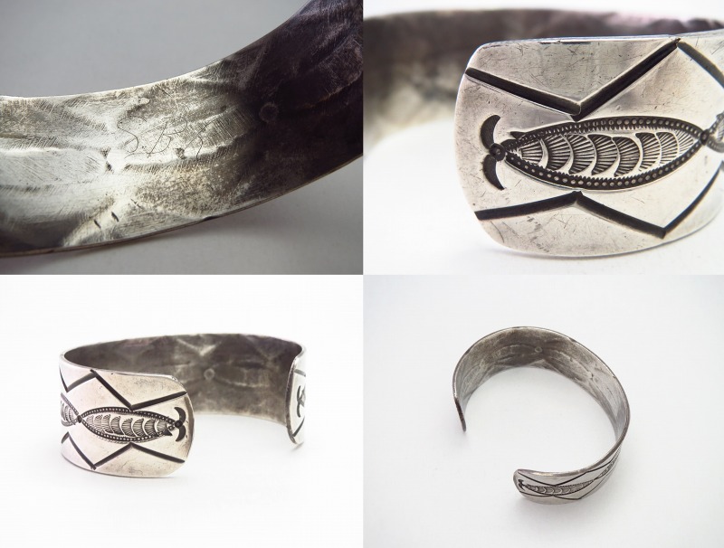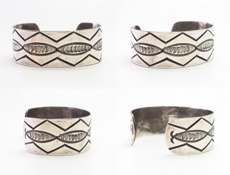 また、製法やディテールからおそらくナバホのシルバースミスによる作品と思われますが、シンプルなスタンプワークの構成はプエブロ(ナバホ以外のアメリカ中西部に起源を持つインディアン部族) の作品も想起させる雰囲気を持っています。