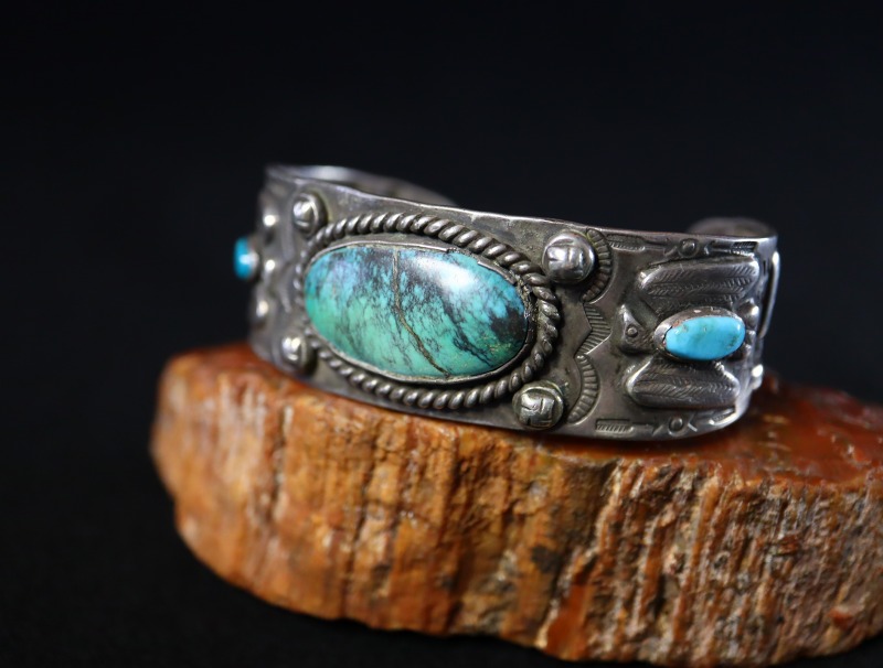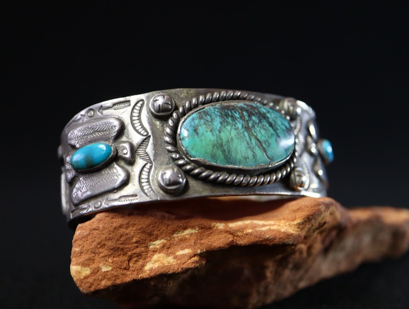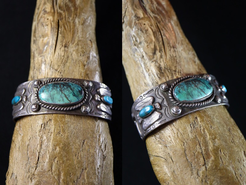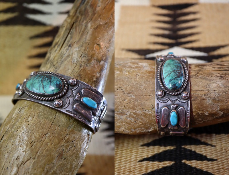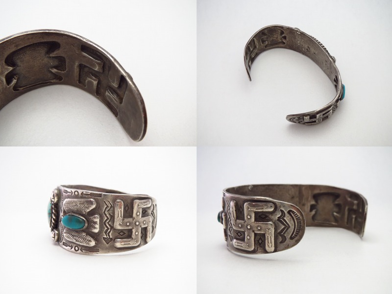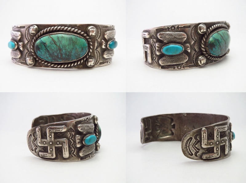 コインシルバーから作られた重厚なバンドをベースに、センターに大きく美しいターコイズがマウントされており、そのベゼルにはツイステッドワイヤーが施されています。さらに、石の四方には立体的な卍がトップとなったナットの様なアップリケがあしらわれています。さらに、サイド~ターミナル(両端)は、大きく立体的なサンダーバードと逆卍のリポウズ/バンプアウトによって迫力を持った造形となっており、それらの間には隙間なくライトニングスネークやアロー等のツーリストアイテムらしいスタンプワークが殆ど隙間なく刻み込まれることで仕上げられています。またその重量【56.5g】とツーリストジュエリーとしては非常に重厚で厚みを持った地金のバングルになります。