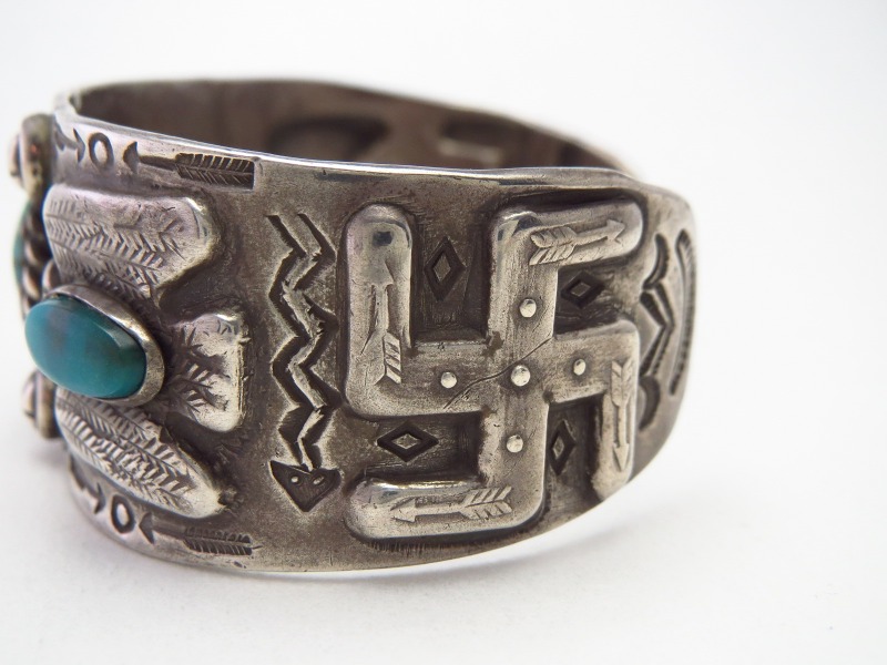 しかしながら、1933年のナチスドイツ出現、1939年にWW2開戦によりアメリカにおいては敵国ドイツのハーケンクロイツと同一記号は不吉だとして使われなくなってしまいました。 当時の新聞記事にも残っていますが、インディアンたちにも卍が入った作品の廃棄が求められ、政府機関によって回収されたりしたようです。 その後、大戦中にも多くが廃棄されてしまった歴史があり、現存しているものは大変貴重となりました。