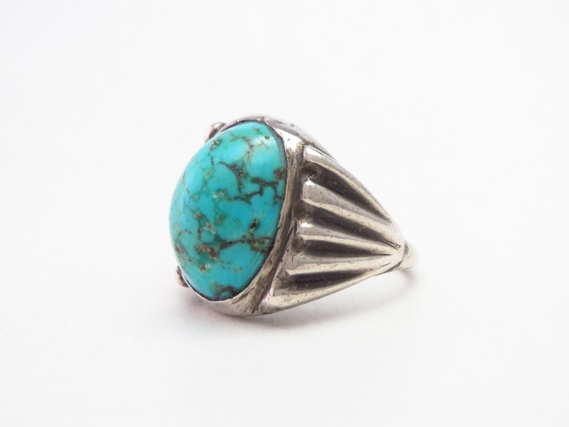 【NAVAJO】ナバホのビンテージジュエリー、サンドキャスト等で造形されたプリミティブで力強い造形をベースに、ハイドームにカボションカットされた味わい深いターコイズがマウントされた作品。ミニマムな造形美と迫力あるボリューム感を持ったアンティーク/ビンテージリングです。