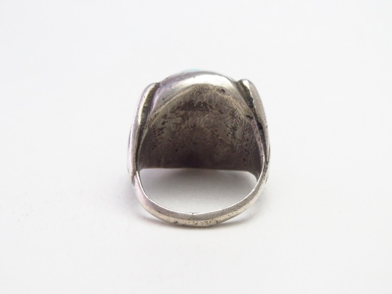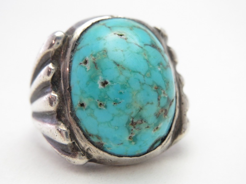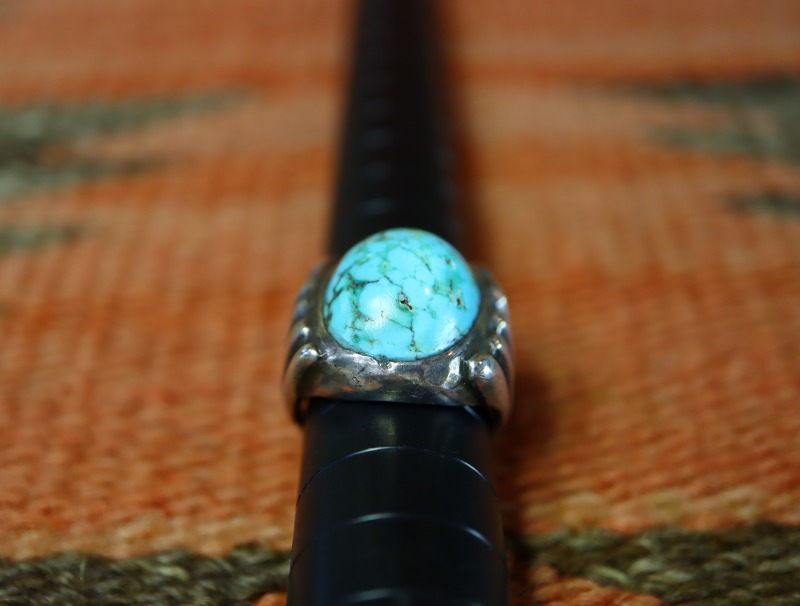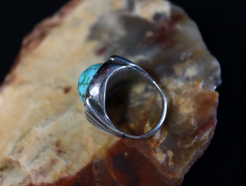 本作もナバホジュエリーにおけるクラシックなデザイン/造形のリングとなっていますが、自然が作り上げたナチュラル無添加ターコイズの表情が付加されることで唯一無二の魅力を放ち、武骨な表情と共にアンティーク工芸品として品位さえ感じさせる作品となっています。