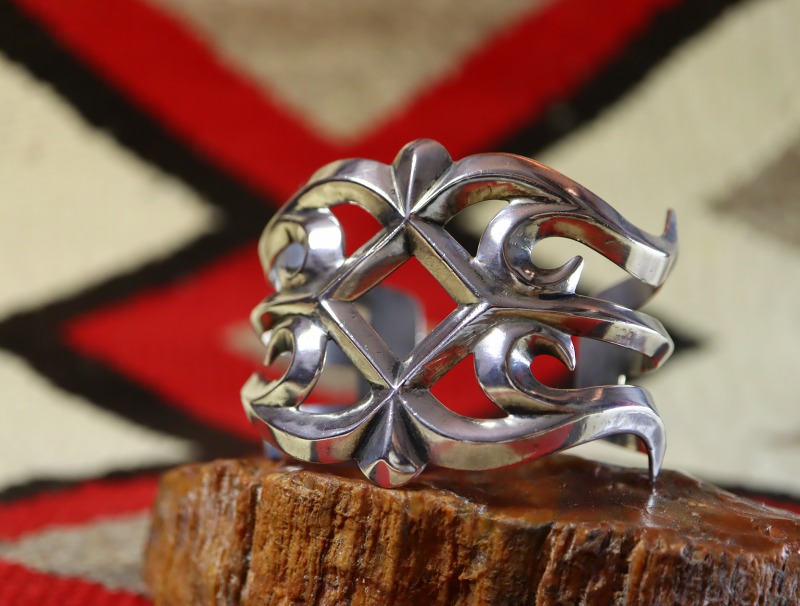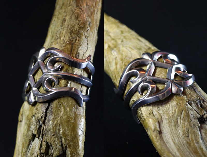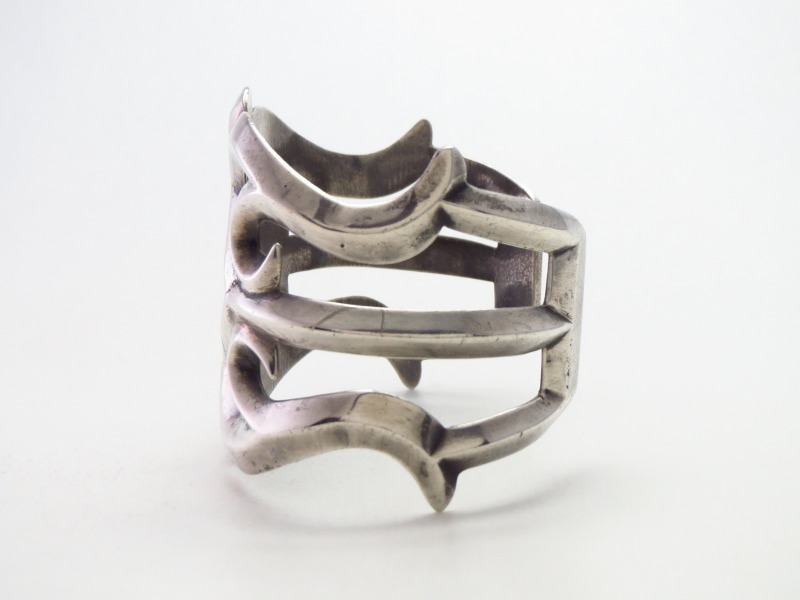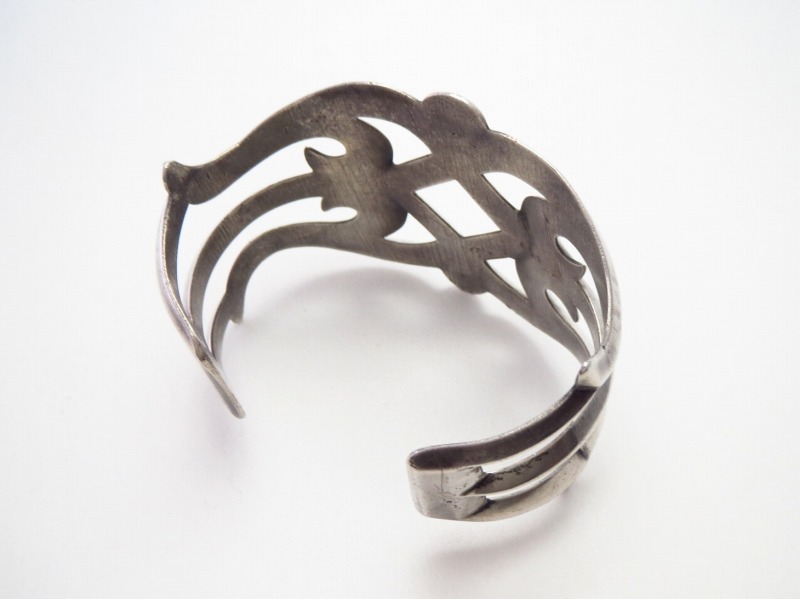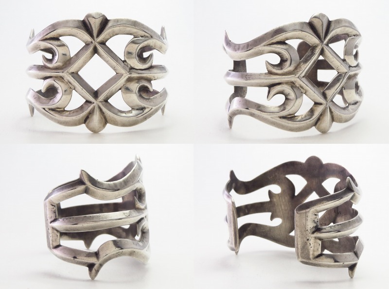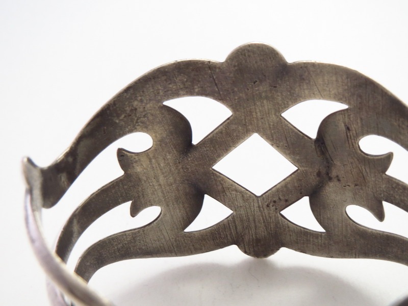 本作のようなサンドキャスト(砂型鋳物)によるシルバーの成形は、ナバホジュエリーでも古典期と呼ばれる創成期からみられる技術の一つであり、長い歴史を持っています。そして、その当時から完成された技術/技法は現在に至るまで大きな変化なく受け継がれており、キャスト製法以外で作られた作品に比べて制作年代の判断が困難です。不確かな判断材料としては、量産化/パターン化されたデザインであるか、内側の処理・仕上げ、シルバー自体の厚みや質などが目安となります。