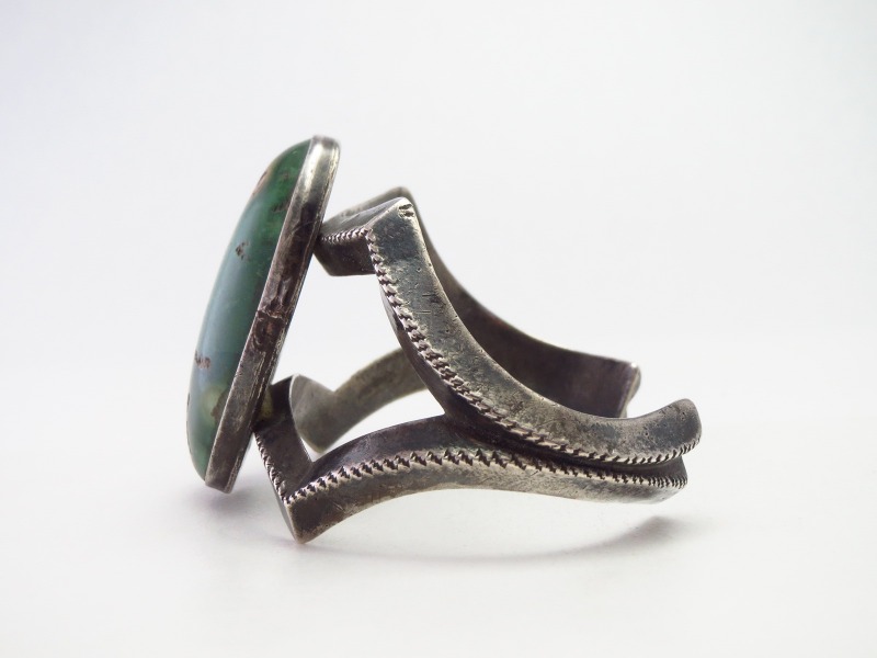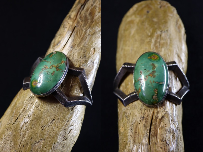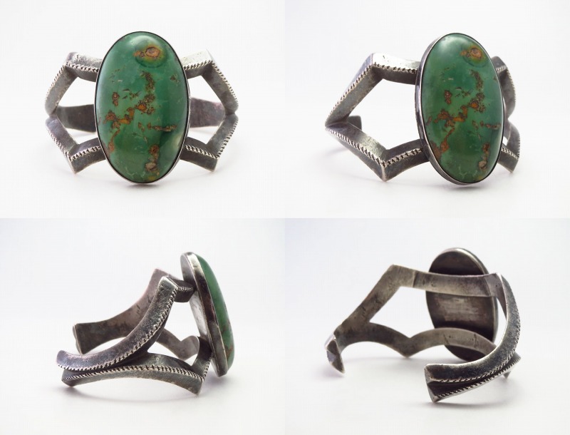 【PUEBLO】プエブロ・【NAVAJO】ナバホの作家が在籍したインディアンクラフトショップ【GARDEN OF THE GODS TRADING POST】ガーデンオブザゴッズトレーディングポストで作られた作品。同トレーディングポストの作品では大変珍しいサンドキャストによって成形されたピースとなっており、大胆なバンドの構成と大きく迫力のあるグリーンターコイズが特徴的なアンティーク/ビンテージバングルです。