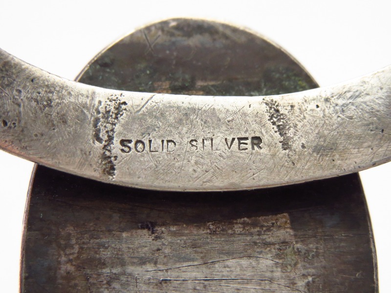 内側に刻印されている『SOLID SILVER』の表記により1920年代末~1930年代前半頃に同トレーディングポストで作られた作品と判断できます。また、当時作られた同工房の銀製品は全てコインシルバーとされており、本作もコインシルバー(品位900=90.0%の純度)で作られています。