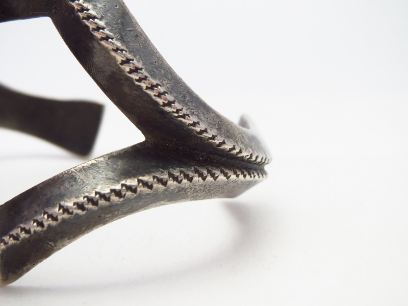 コインシルバー(銀塊)を用いサンドキャスト(砂型鋳物)から成形されたバンド/地金は、非常に重厚に仕上げられています。サンドキャストによるシルバーの成形は、ナバホジュエリーでも古典期と呼ばれる創成期からみられる技術の一つであり長い歴史を持っていますが、GARDEN OF THE GODS TRADING POSTのオーナーであった【Charles E. Strausenback】チャールズ・E・ストローセンバックは、サンドキャスト成形を好まなかったとさえ伝えられているほど、サンドキャスト技法を用いた作品は残されていません。しかしながら、本作に刻印されている『SOLID SILVER』の刻印は、同トレーディングポスト固有の刻印であり、バンドを構成するトライアングル型の断面のエッジ部分に施された力強いスタンプワークは、同工房の作品において多く見られる特徴的なディテールとなっています。