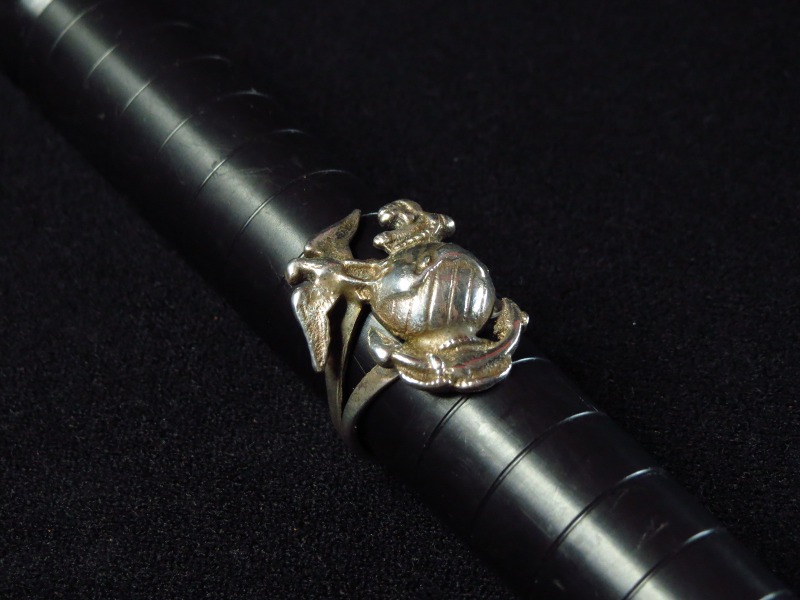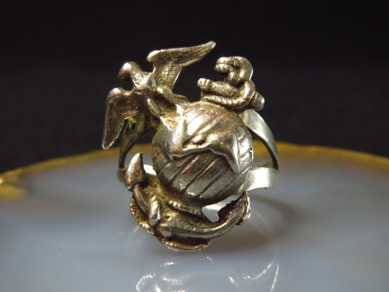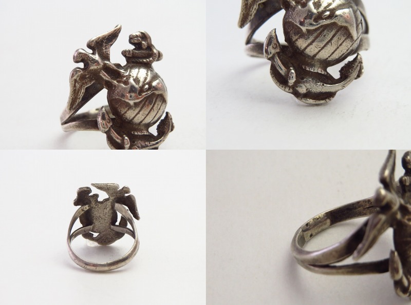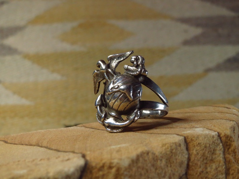 海兵隊所属の軍人や退役軍人がナバホの職人にオーダーしたものと思われ、1960年代~1970年代頃に作られたと推測される作品。ビンテージインディアンジュエリーでも極希に見つかるミリタリーに関連した特殊なピースです。ナバホ族/ディネの人たちも多くが従軍し、主に暗号部隊として活躍した歴史があり、従軍したシルバースミスが自分のために制作したピースである可能性もありますが、おそらくは当時の海兵隊に所属した軍人からのオーダーピースです。