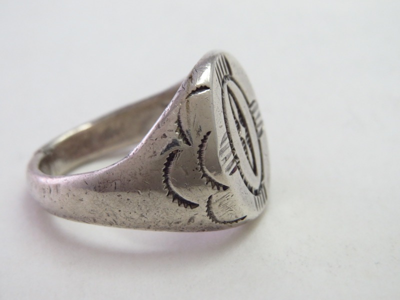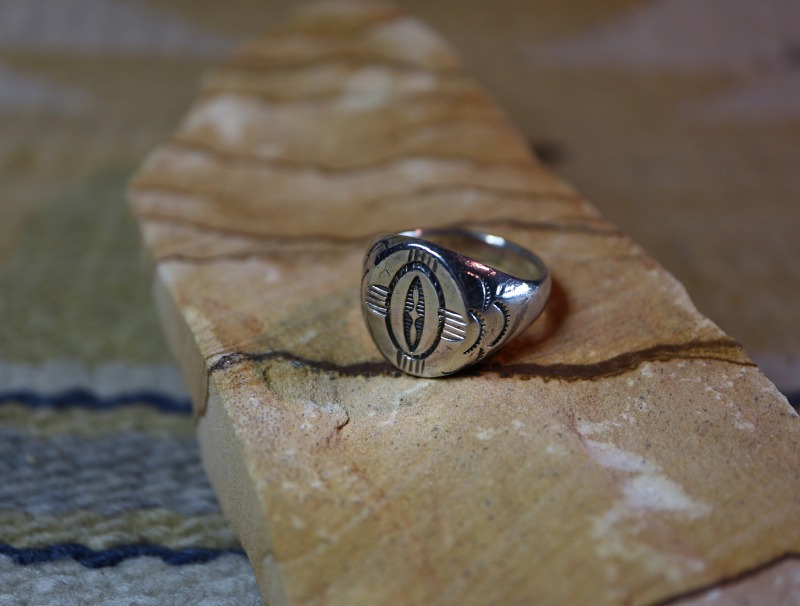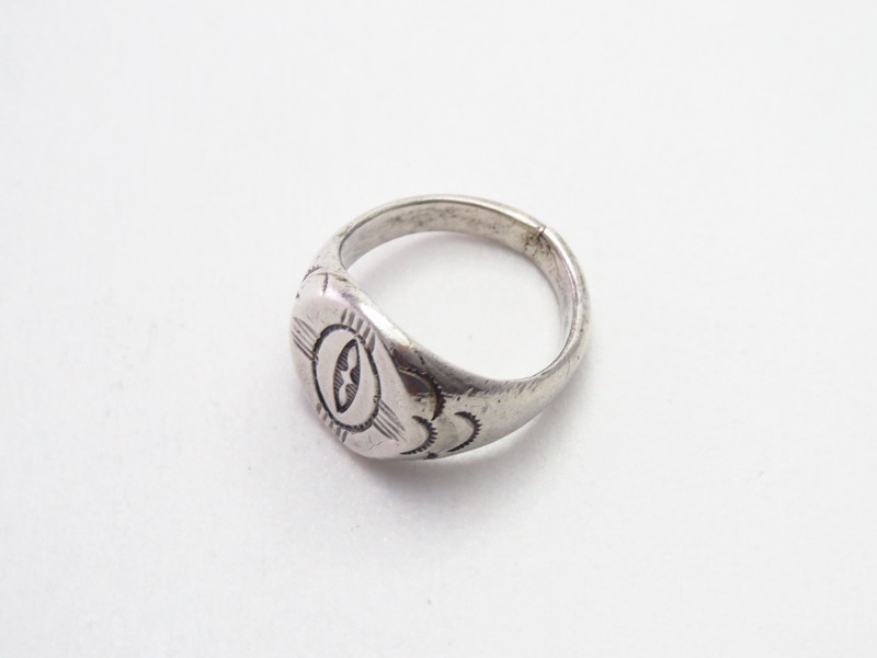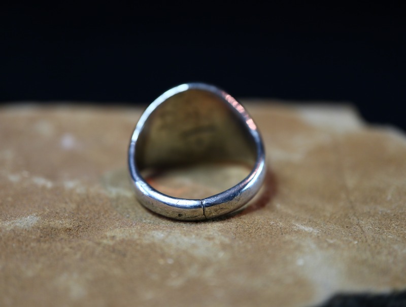 本作の様なシールリングの造形は後に、ある程度形作られた土台となるリングそのものがキャスト(鋳物)によって量産され、ジュエリー材料のショップで手軽に購入できるようになってしまいます。それらの元となった作品が、本作の様にインゴットから成形されたアンティーク作品であり、現代においてはインディアンジュエリーの歴史を紐解く上で重要な参考資料ともなる資料価値の高い作品です。