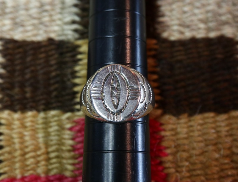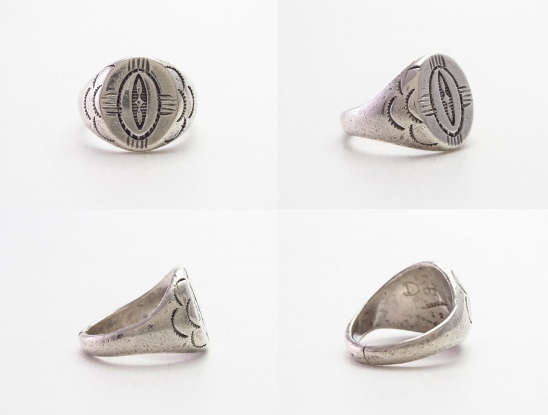 【NAVAJO】ナバホジュエリーの中でも短期間のみ使用され、そのクオリティーを保証する稀有なホールマーク『U.S.NAVAJO』【Indian Arts & Crafts Board】(IACB)の刻印されたピースで、末尾に記されたトレーディングポスト等の制作元を表すナンバーは【2】。つまり【C. G. Wallace Trading Post】C.G.ウォレスインディアントレーディングポストで制作されたものと特定可能な作品。シールリングの造形をベースに、力強く洗練されたスタンプワークで仕上げられたアンティーク/ビンテージリングです。