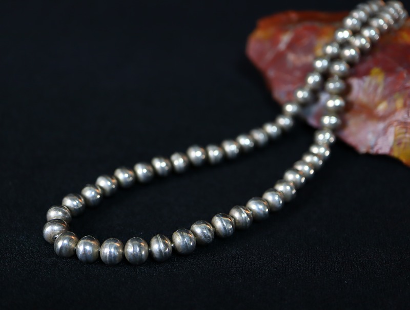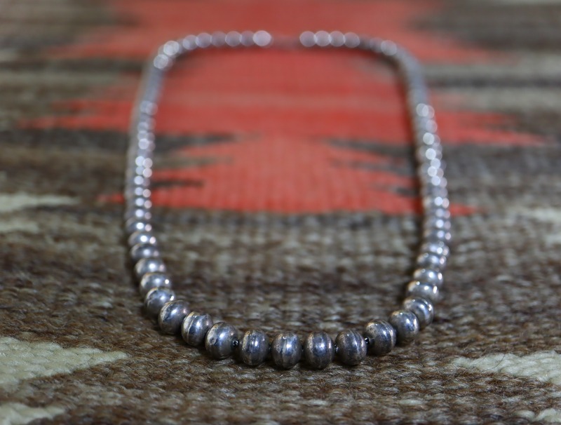 ナバホの伝統的なシルバービーズは、現地において『ナバホパール』(ナバホの真珠)や『デザートパール』(砂漠の真珠)等とも呼ばれ、本作の様にビーズのサイズが小さい程、そしてシルバーが厚くなる程に、形作る為に高い技術が必要となります。また、本作は総重量が約<52g>となっており、とても心地よい重量感のネックレスとなっています。