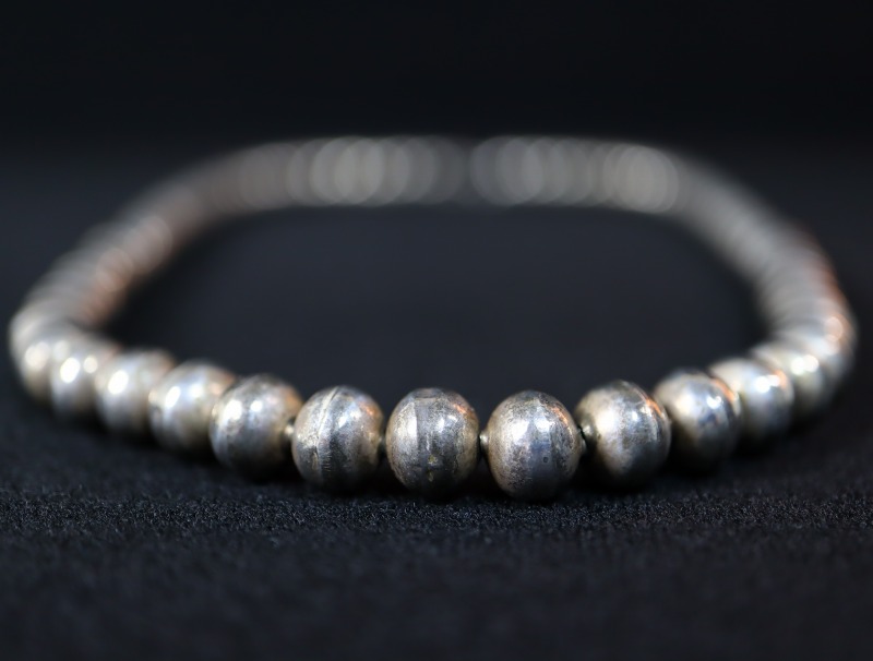 【NAVAJO】ナバホか【PUEBLO】プエブロのビンテージジュエリー、『ナバホパール』とも呼ばれる84個ものベンチメイド(ハンドメイド)シルバービーズで構成された作品。良い重量感を持つ質の高いシルバービーズで、シンプルながら伝統的な製法による味わい深い表情等、ナバホジュエリーの独特な魅力を宿すアンティーク/ビンテージネックレスです。