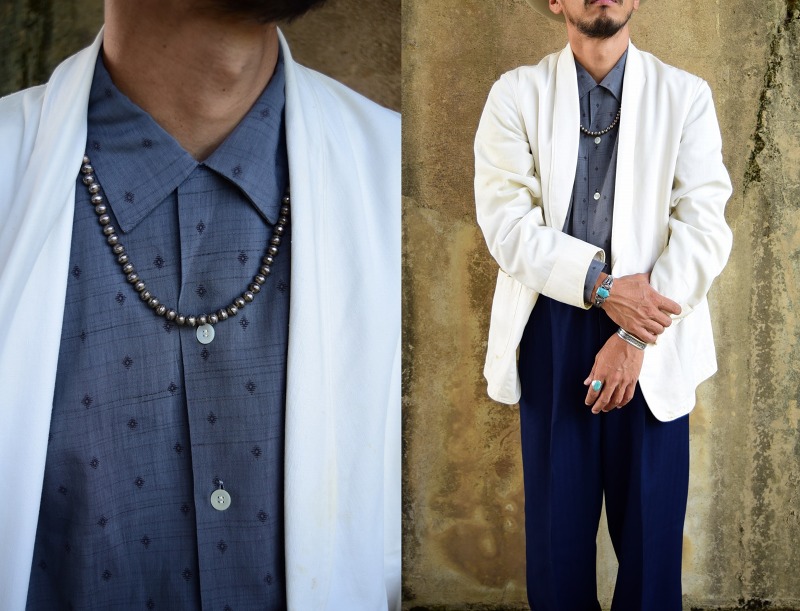 現代にも受け継がれるナバホパール/シルバービーズのネックレスですが、ビンテージ独特の質感や柔らかな表情を持っています。またその普遍的な造形美や渋いシルバーの表情は、性別や季節を問わず多くのスタイルにフィットし、日常の良いアクセントになるアイテム。女性にはエレガントにフィットしますが、男性にもさりげなくお使いいただける非常に汎用性の高いネックレスとなっています。