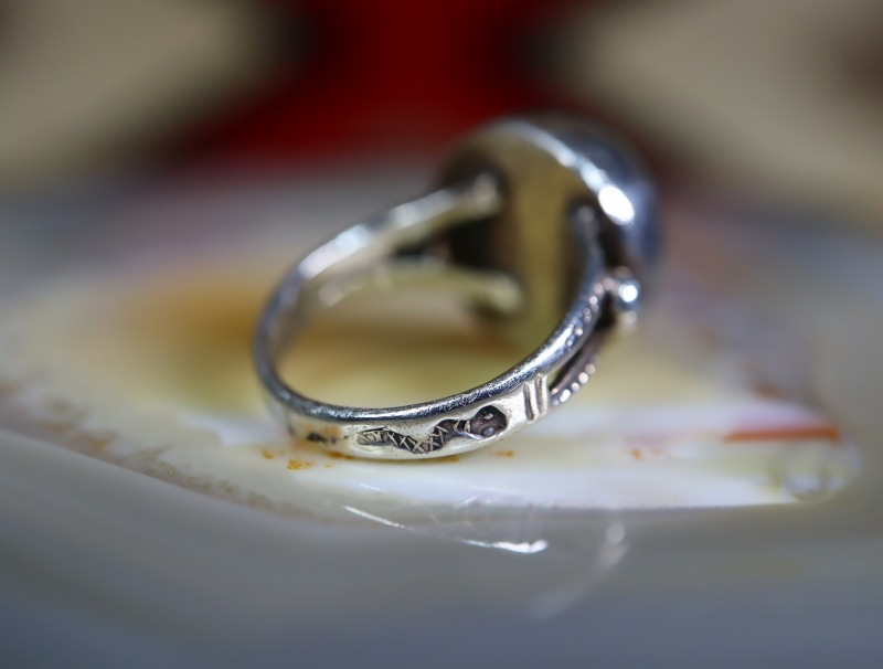 【Tourist Jewelry】ツーリストジュエリーや【Fred Harvey Style】フレッド・ハービースタイルと呼ばれる、20世紀前半のサウスウエスト観光産業の隆盛に合わせて作られた作品の一つですが、そんなスーベニアアイテムの中でも全ての工程がハンドメイドで仕上げられていると思われます。その為、生産に機械化や分業化が導入されたスーベニアジュエリーとは一線を画すクオリティをもったリングとなっています。