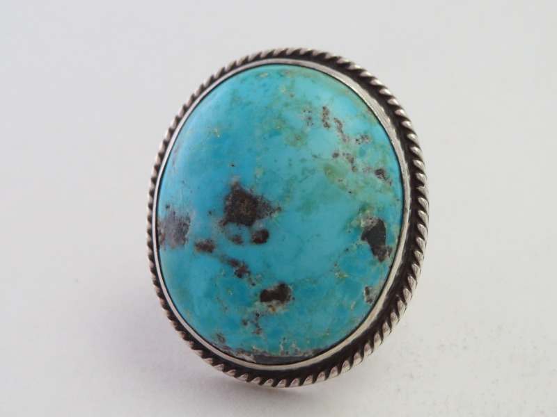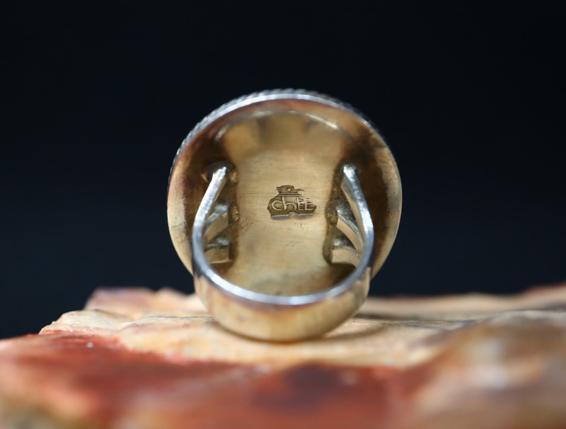 シャンクは、厚いシルバーから成形されており、フロントが『スプリットシャンク』と呼ばれる伝統的な造形で3本に割り開かれています。大きく造形されたフェイスは、大きくハイドームなカットのパージャンターコイズがマウントされることで、独特なバランスのリングに仕上げられています。また、石を留めるベゼル(覆輪)には、2本のシルバーワイヤーを撚り合わせることで作るツイステッドワイヤーが施されています。Mark Cheeの残したターコイズジュエリーの中では、石のクオリティの高い作品ではありませんが、石と一体化されたようなベゼルの仕上げや、特別なボリューム感を持ったデザイン・造形の独特な雰囲気等には、やはりMark Cheeらしさを感じることができます。