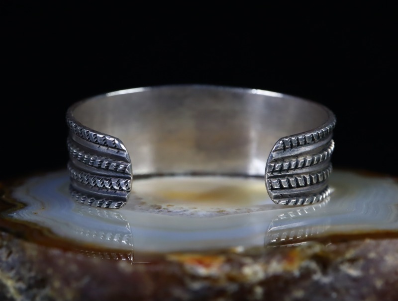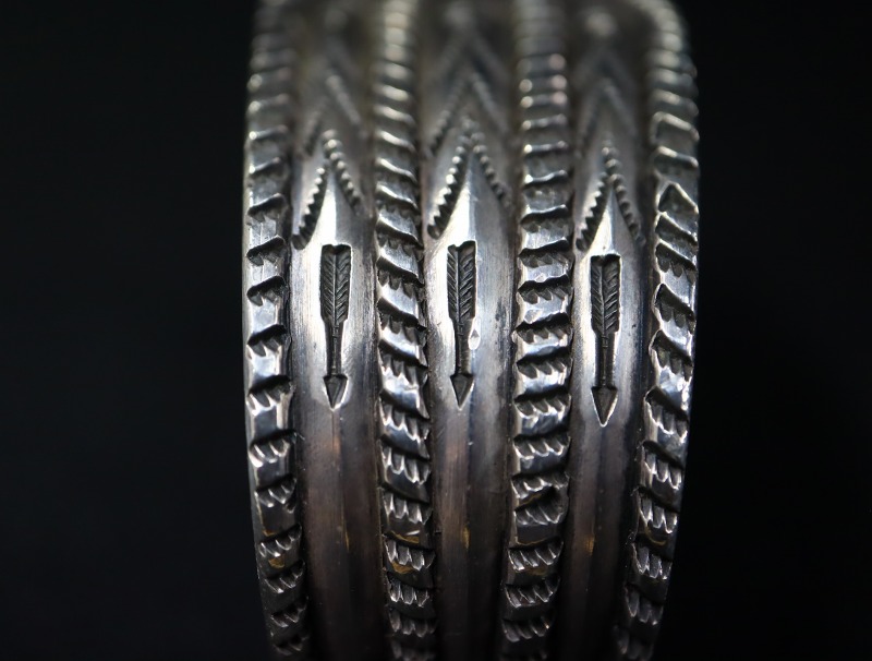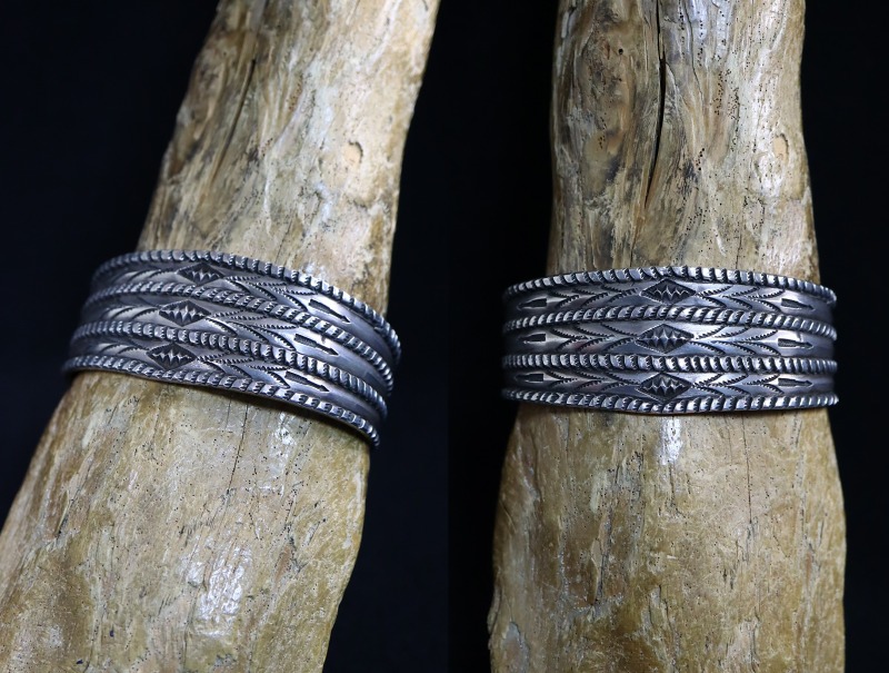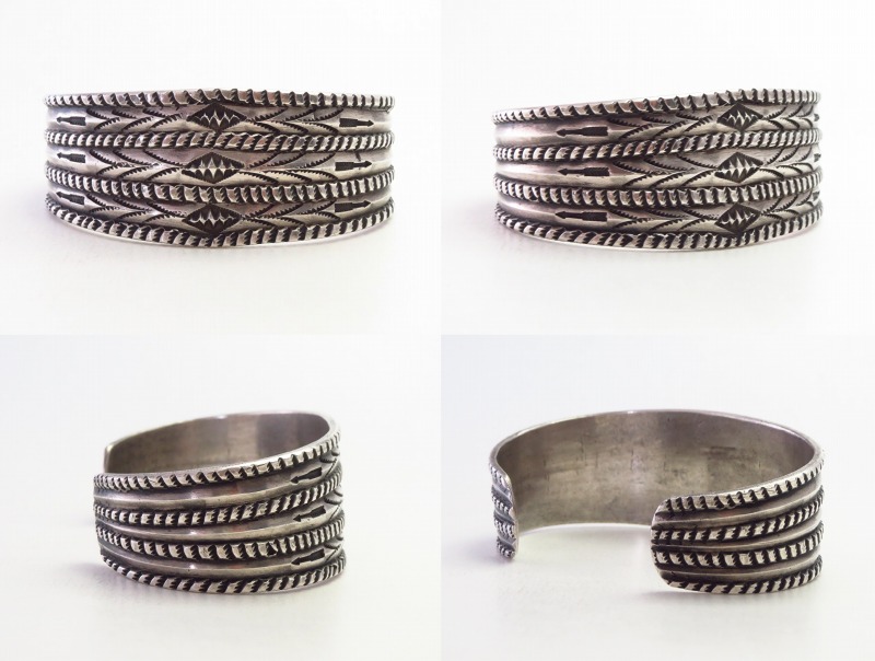 また、凹凸ライン上には細かなスタンプワークが刻まれており、アローモチーフ等からは、ツーリスト向けアイテムとしての側面も感じられ、力強く細かく打ち込まれたスタンプワークからもナバホジュエリーらしさと、強い陰影と奥行きを生み出す作者の思いを宿すかの様なシルバーワークが見て取れます。