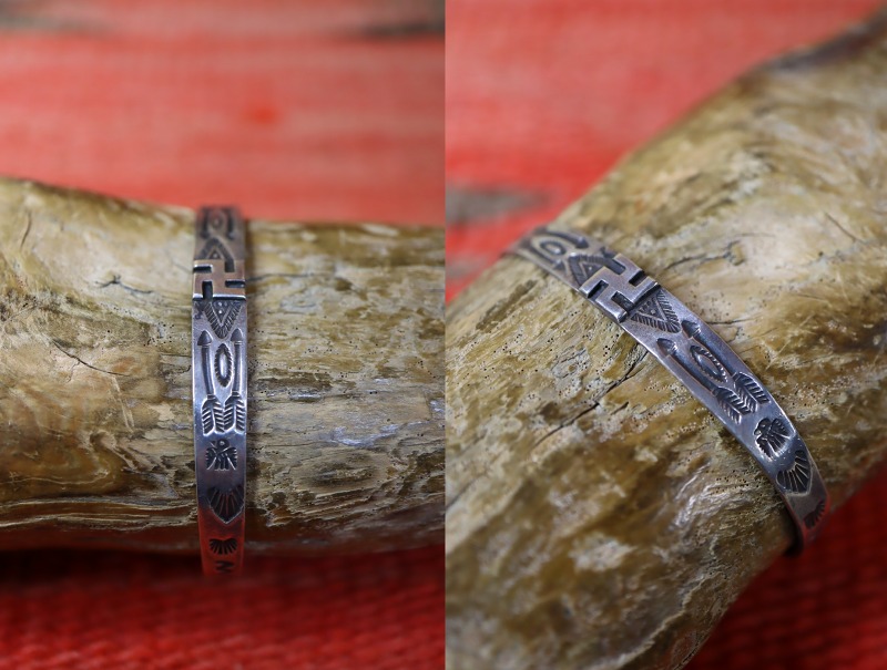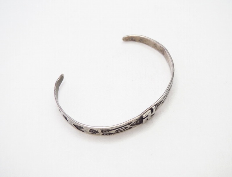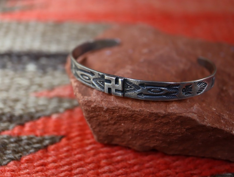 【NAVAJO】ナバホのアンティークジュエリー、インゴットシルバー(銀塊)から成形されたと思われるバンド/地金のセンターに【卍】Whirling Log/Nohokosのアップリケが施され、アローやサンダーバード等の力強いスタンプワーク刻まれた作品。非常に小さいサイズのアンティーク/ビンテージバングルです。