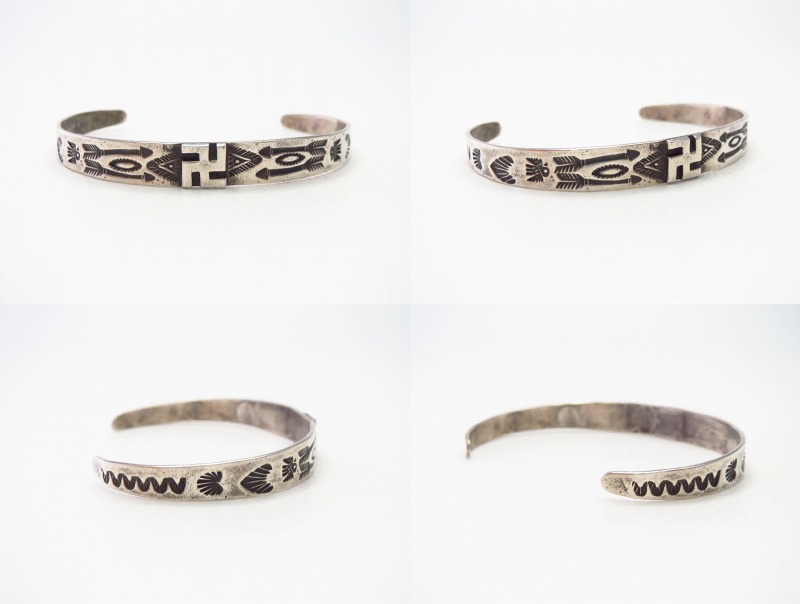 1920年代後半~1930年代製と思われる作品で、フロントからターミナル(両端)にかけて少しづつ細くなるクラシックなシェイプをベースとしています。その中央に分厚い卍がアップリケされ、それを中心にしてアローやサンダーバード等のアンティークナバホジュエリーらしいスタンプワークが左右対称に刻まれています。
